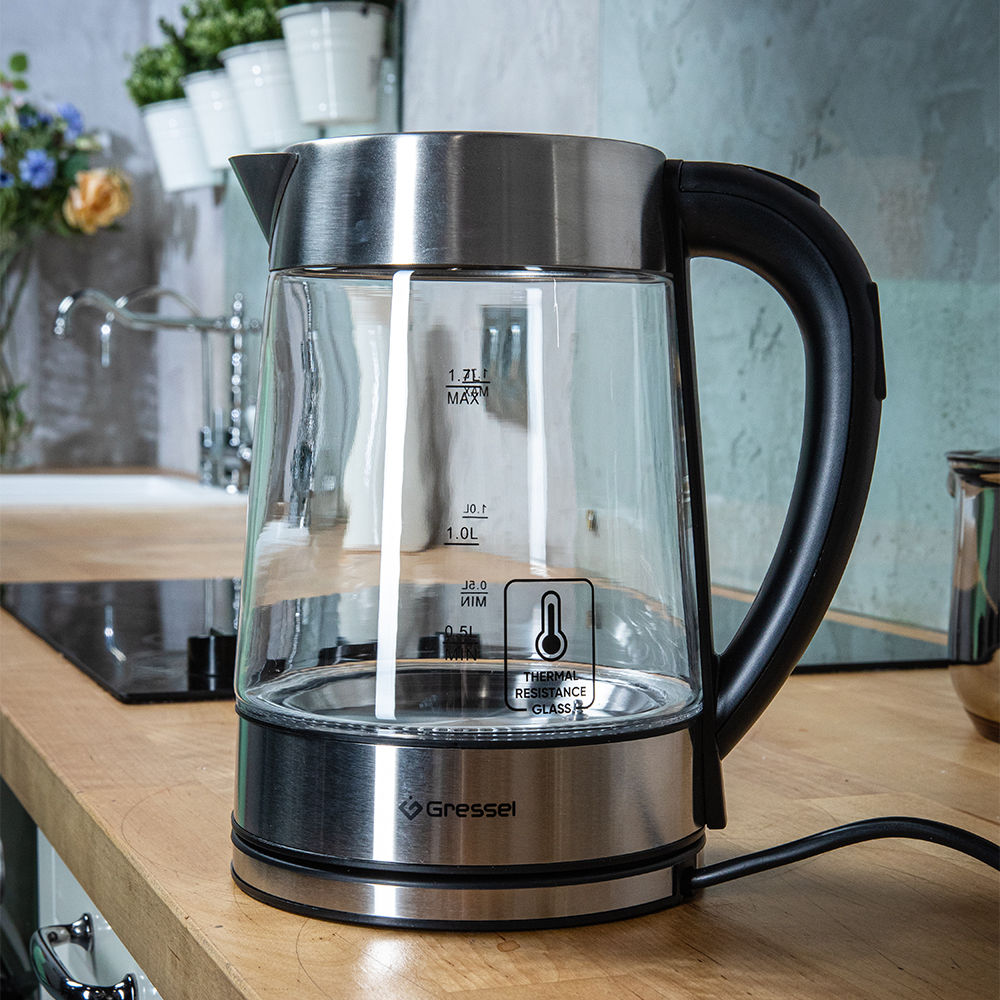 Электрический чайник Gressel GRK-1106 выполнен из качественных материалов, включая термостойкое стекло, нержавеющую сталь и прочный пластик. Он станет не только функциональным, но и декоративным элементом вашей кухни.