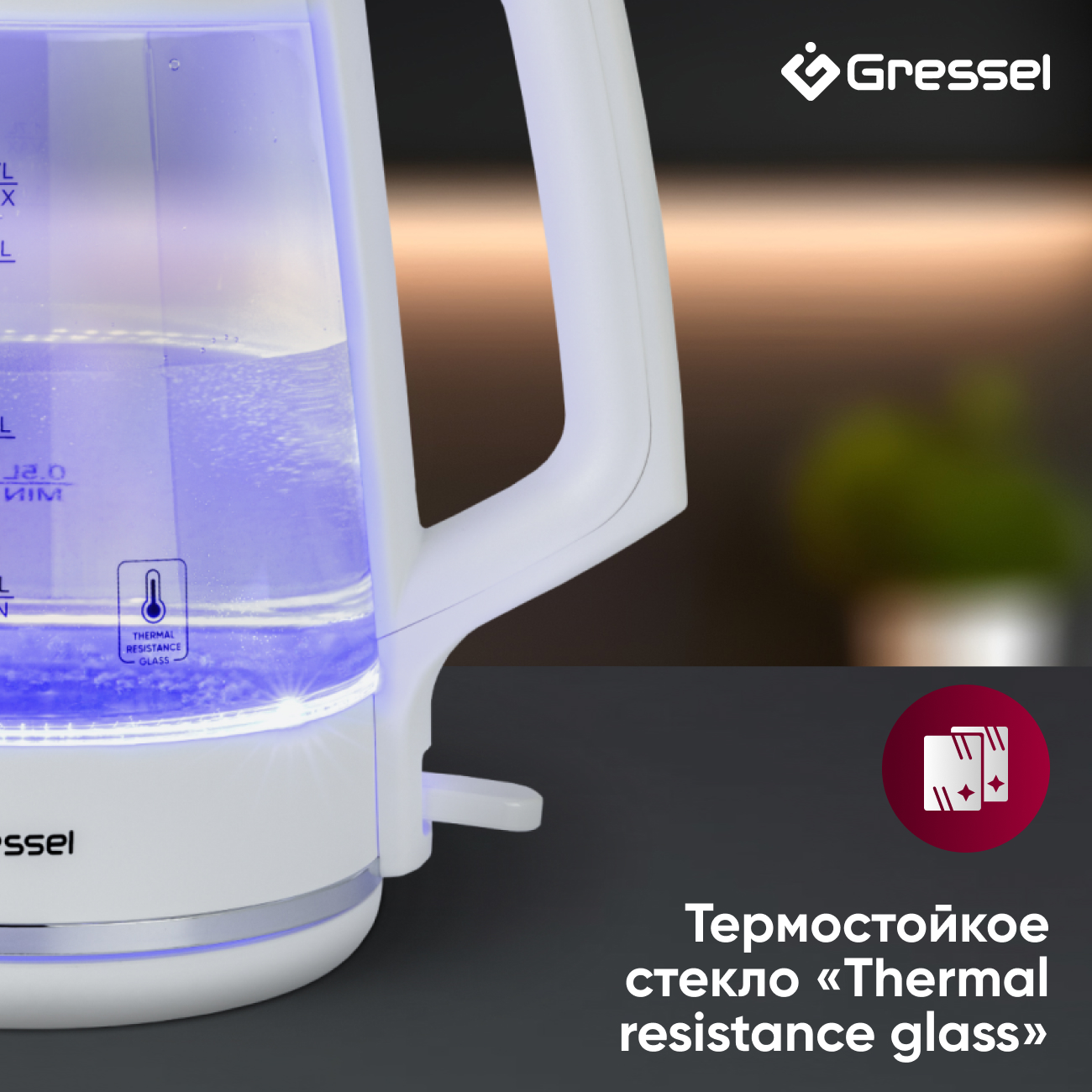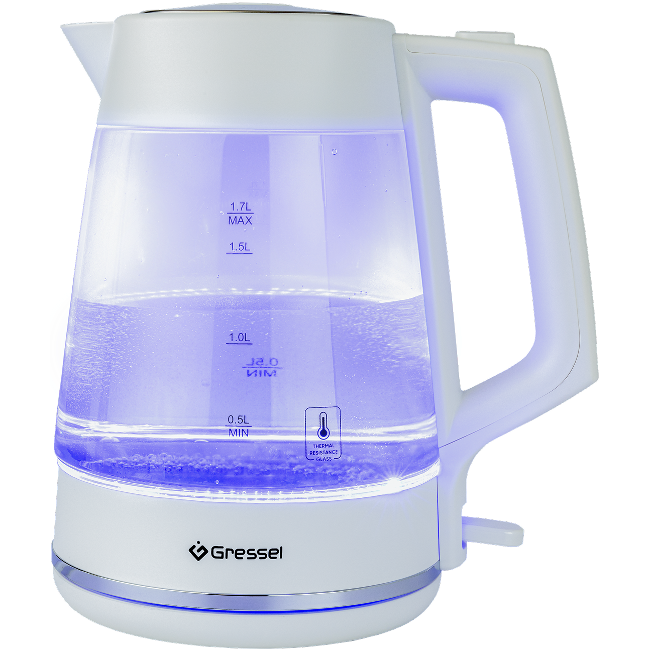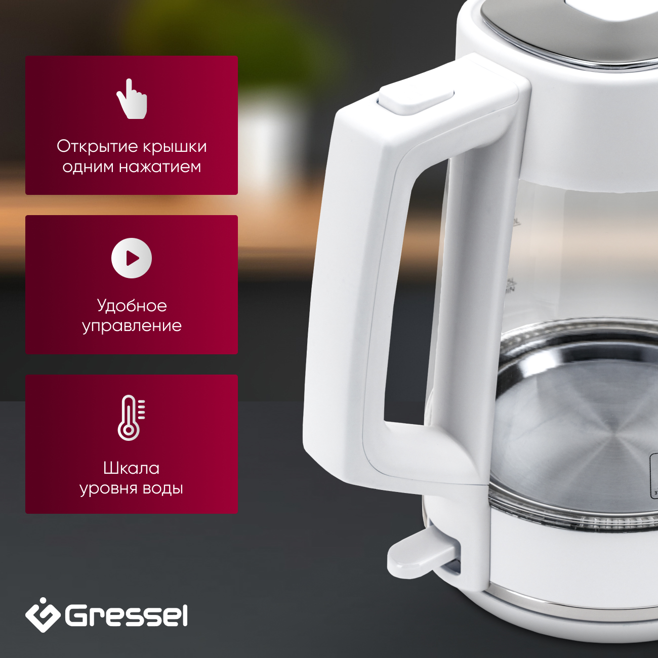 Электрический чайник Gressel GRK-1114, 1.7л, 2200Вт, защита от перегрева, контроллер Strix, подсветка, сетчатый фильтр, термостойкое стекло, белый