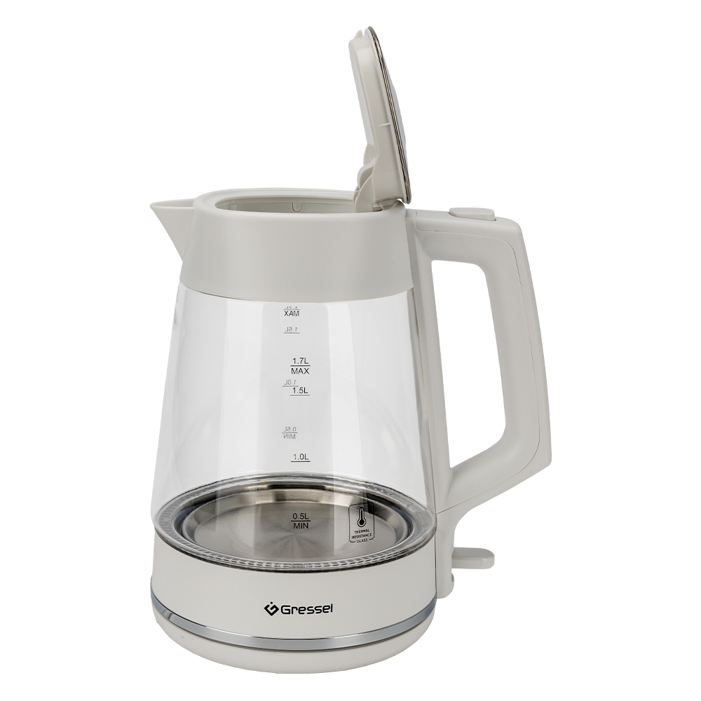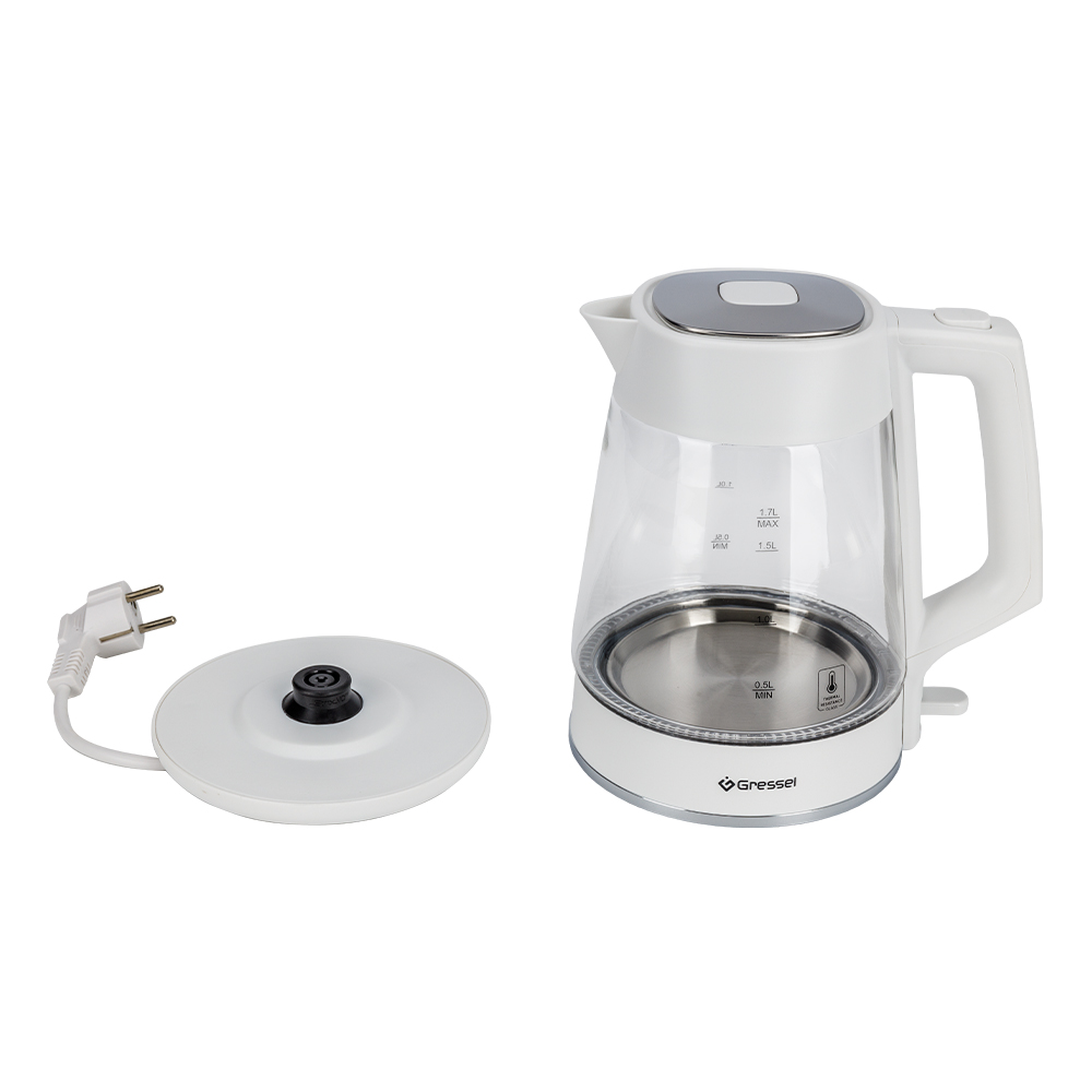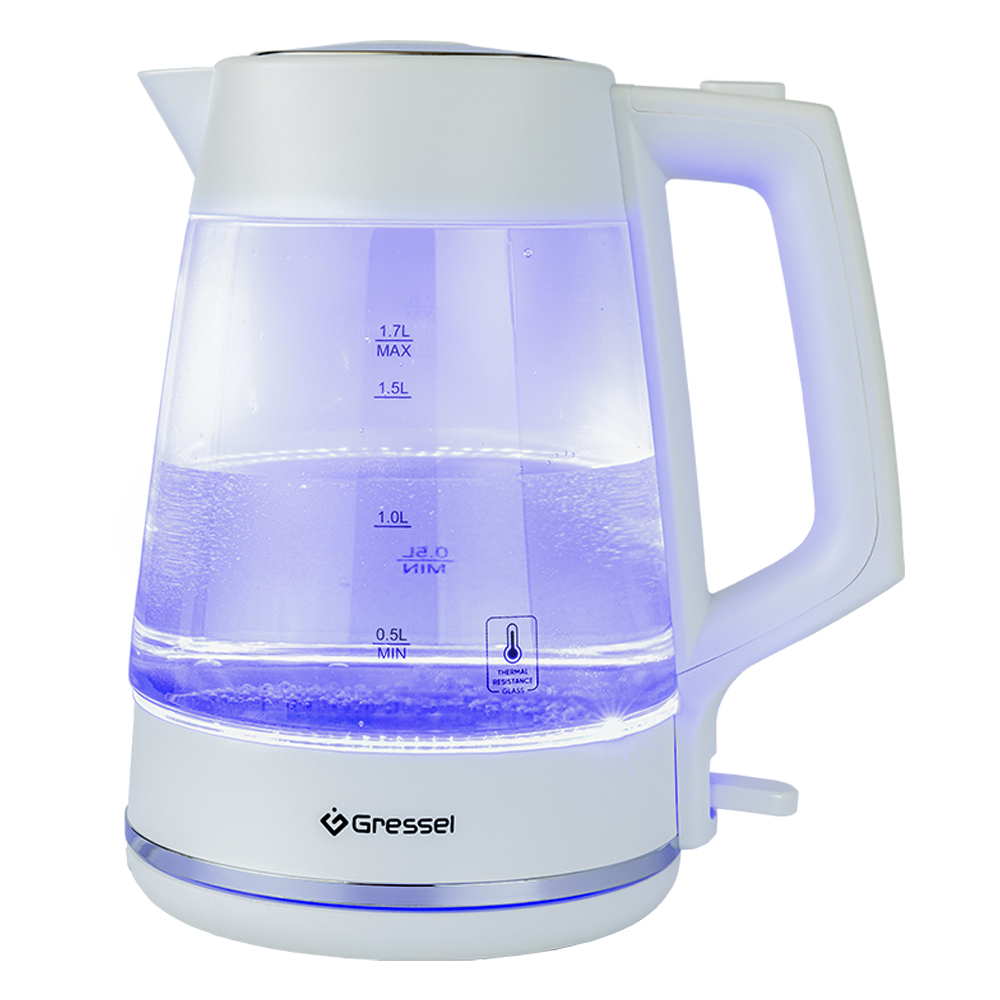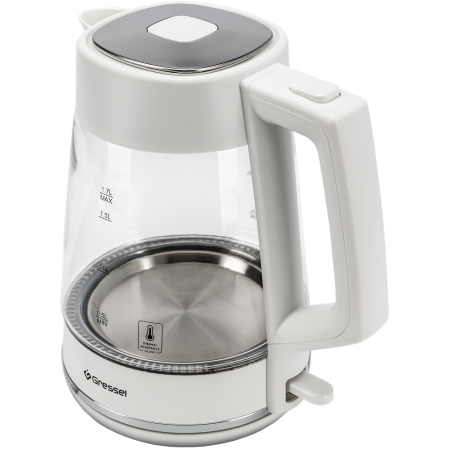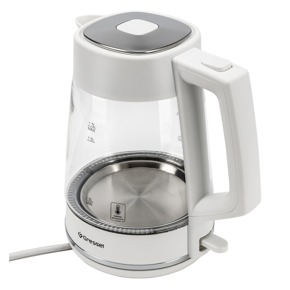 Электрический чайник Gressel GRK-1114, 1.7л, 2200Вт, защита от перегрева, контроллер Strix, подсветка, сетчатый фильтр, термостойкое стекло, белый