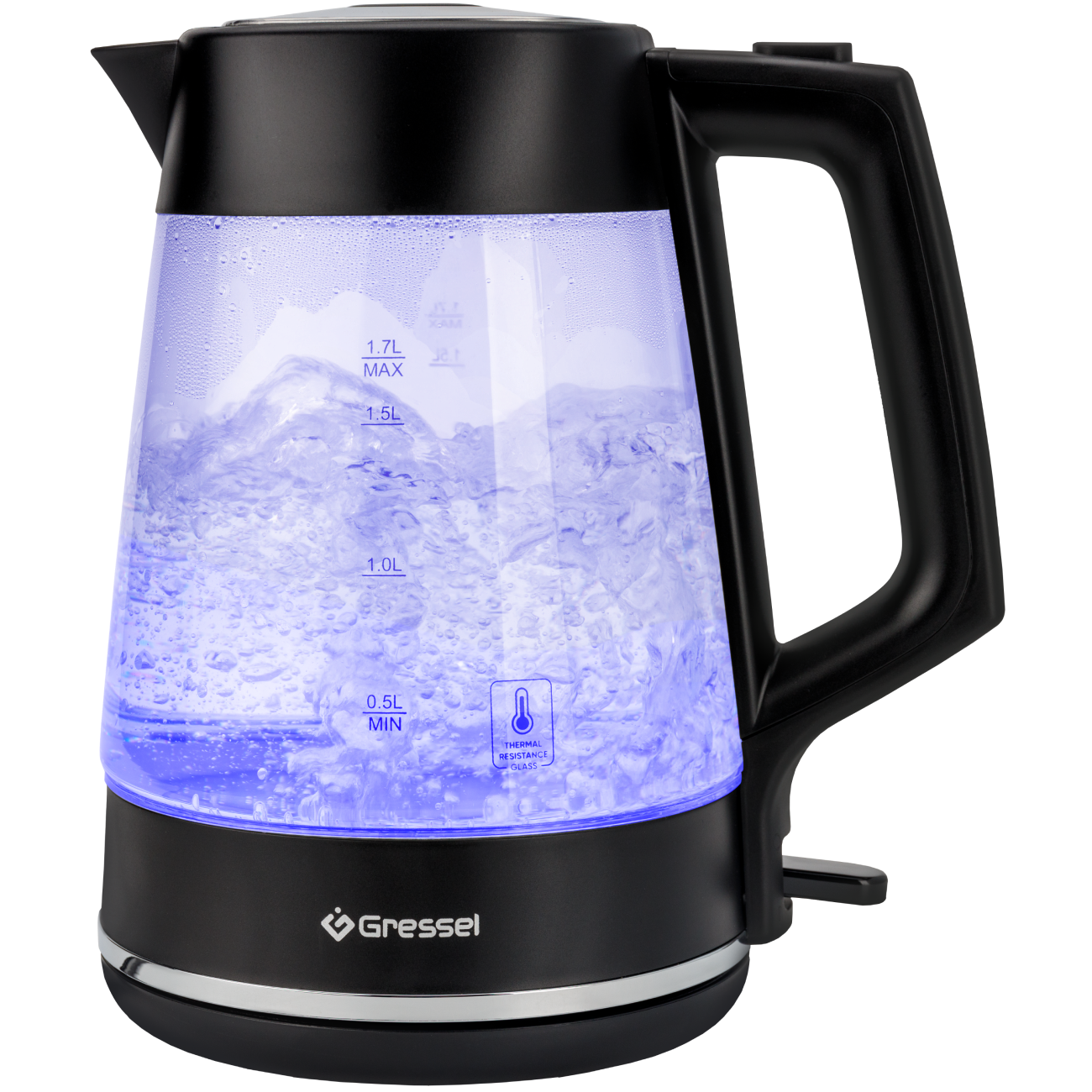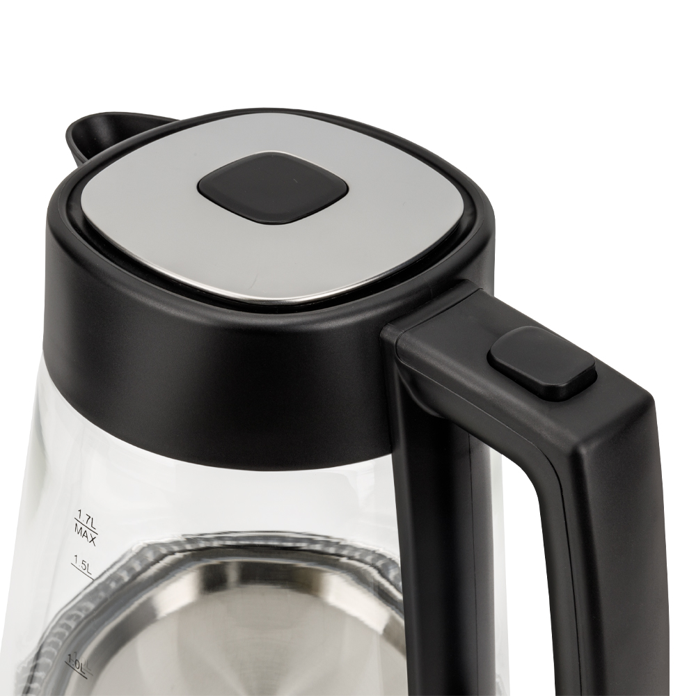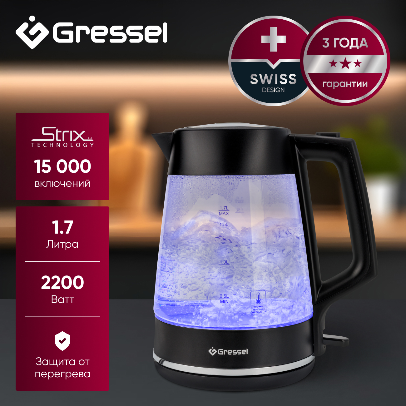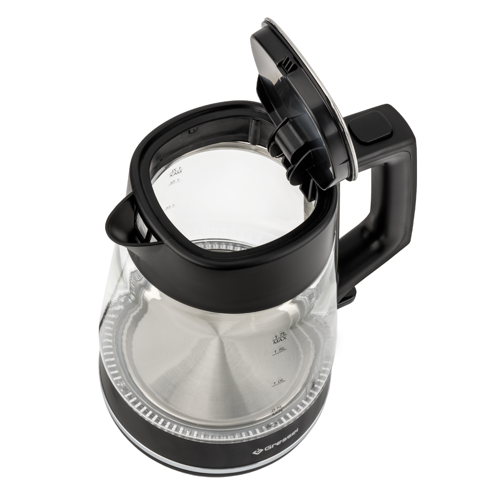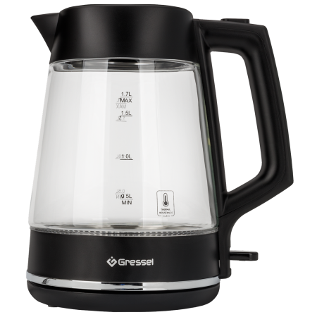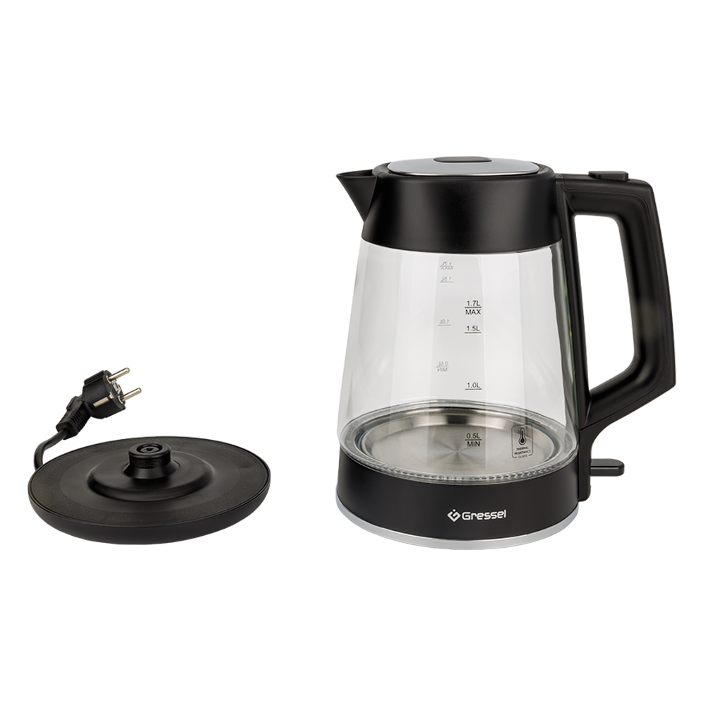 Электрический чайник Gressel GRK-1115, 1.7л, 2200Вт, защита от перегрева, контроллер Strix, подсветка, сетчатый фильтр, термостойкое стекло, черный