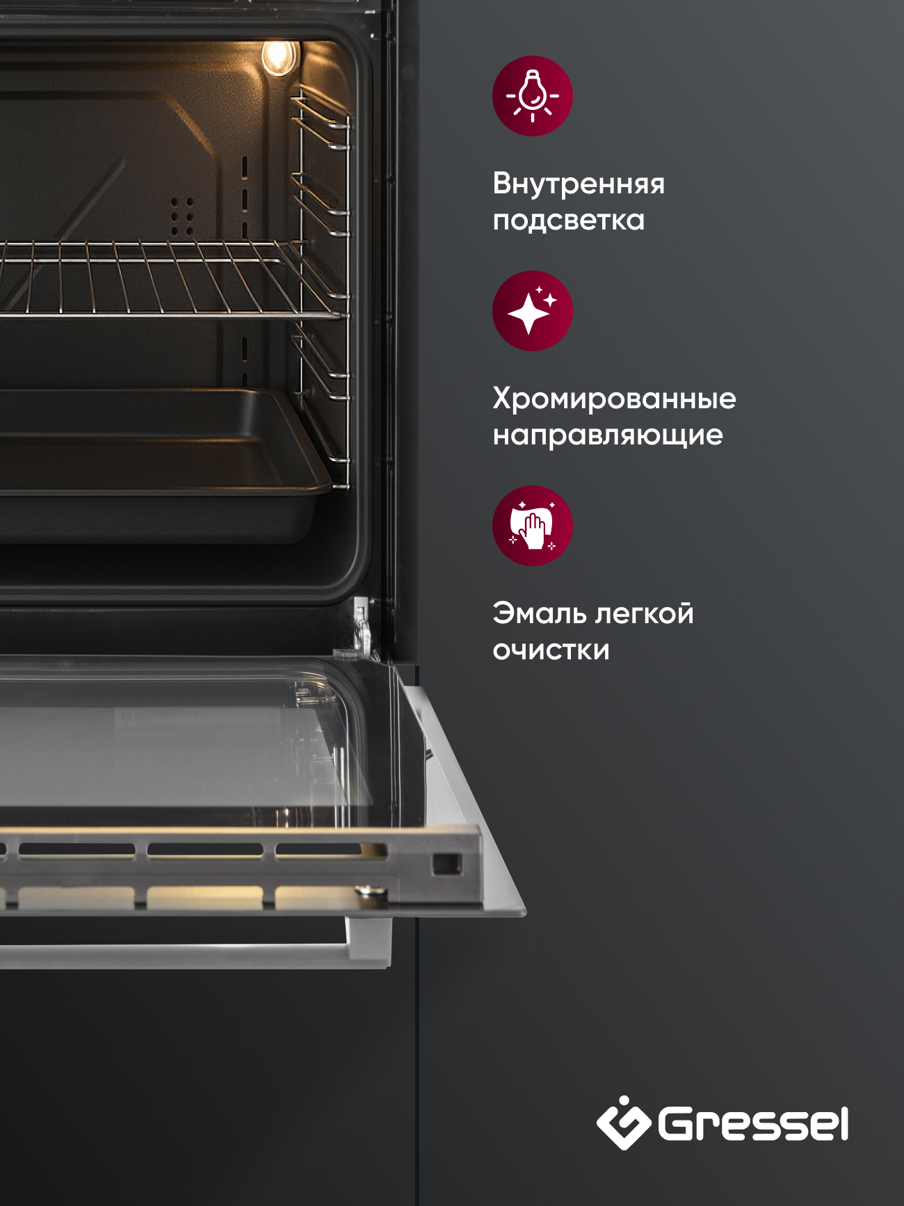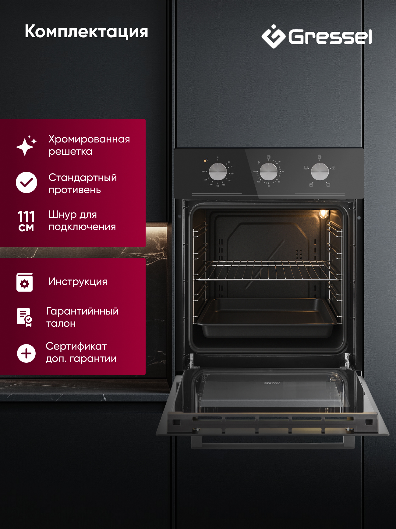 Духовой шкаф Gressel U4ES14000 создан для тех, кто хочет получать максимум возможностей даже в компактной кухне. При ширине всего 45 см он вмещает 50 литров — достаточно, чтобы приготовить ужин для всей семьи или порадовать гостей домашней выпечкой. Тройное остекление дверцы и доводчик делают использование комфортным и безопасным: стекло остается прохладным, а дверца закрывается мягко и бесшумно. Четыре режима нагрева — от классического верхнего и нижнего до двойного гриля — позволяют легко подобрать оптимальные условия для любого блюда. Подсветка на основе галогенной лампы дает хороший обзор внутри камеры, а вентилятор охлаждает корпус и защищает мебель. Эмаль легкой очистки упрощает уход: достаточно протереть поверхность после готовки. Стильное черное стекло впишется в современный интерьер, а гарантия 3 года станет дополнительным подтверждением надежности техники.