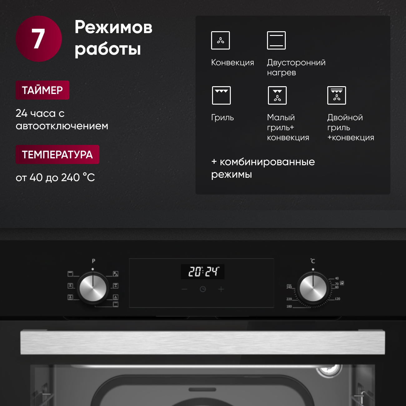 Таймер 24 часа с автоотключением и 7 режимов: Температурный диапазон от 40 до 240° C и семь режимов приготовления, включая большой и малый гриль, конвекцию и их комбинации, дают полную свободу для кулинарного творчества.