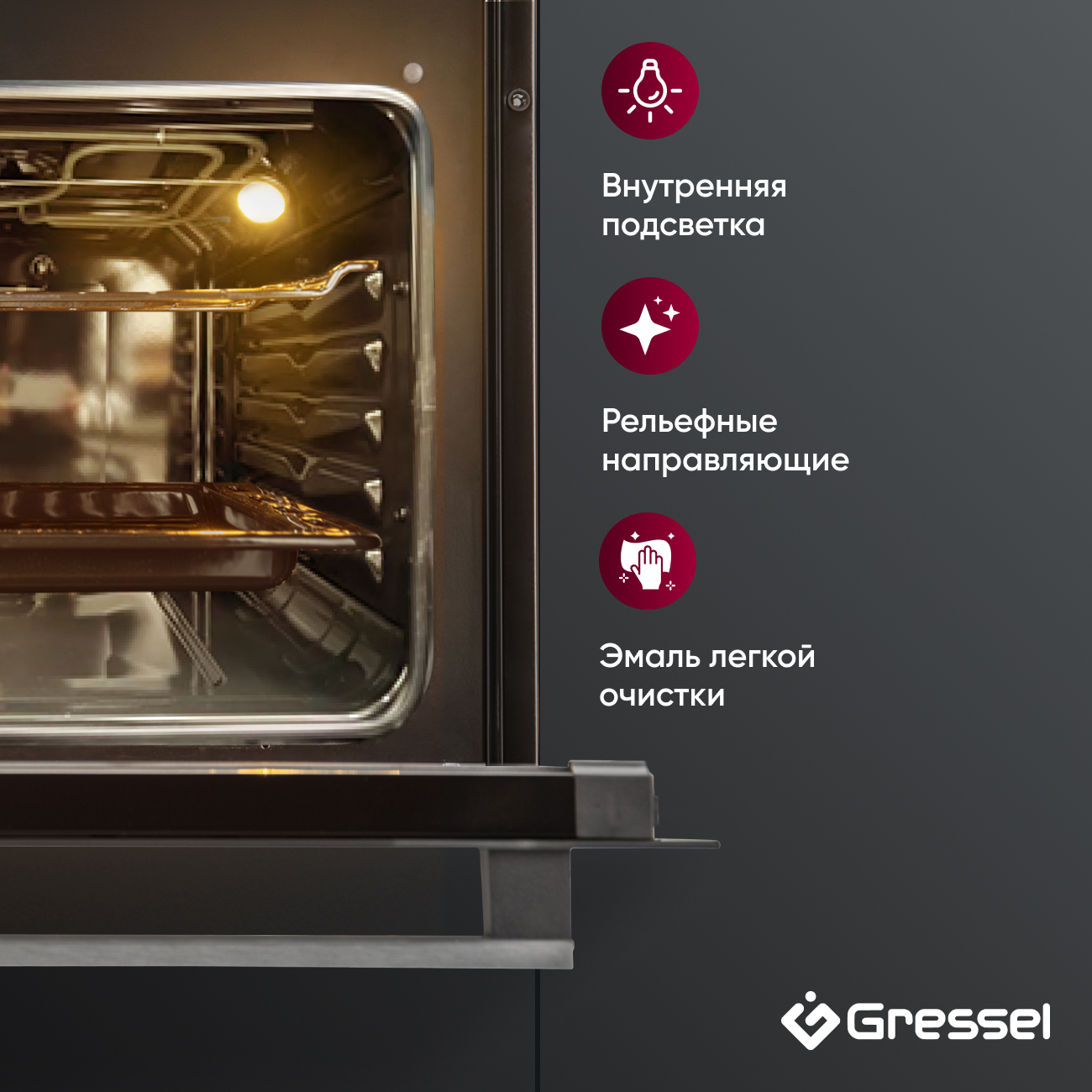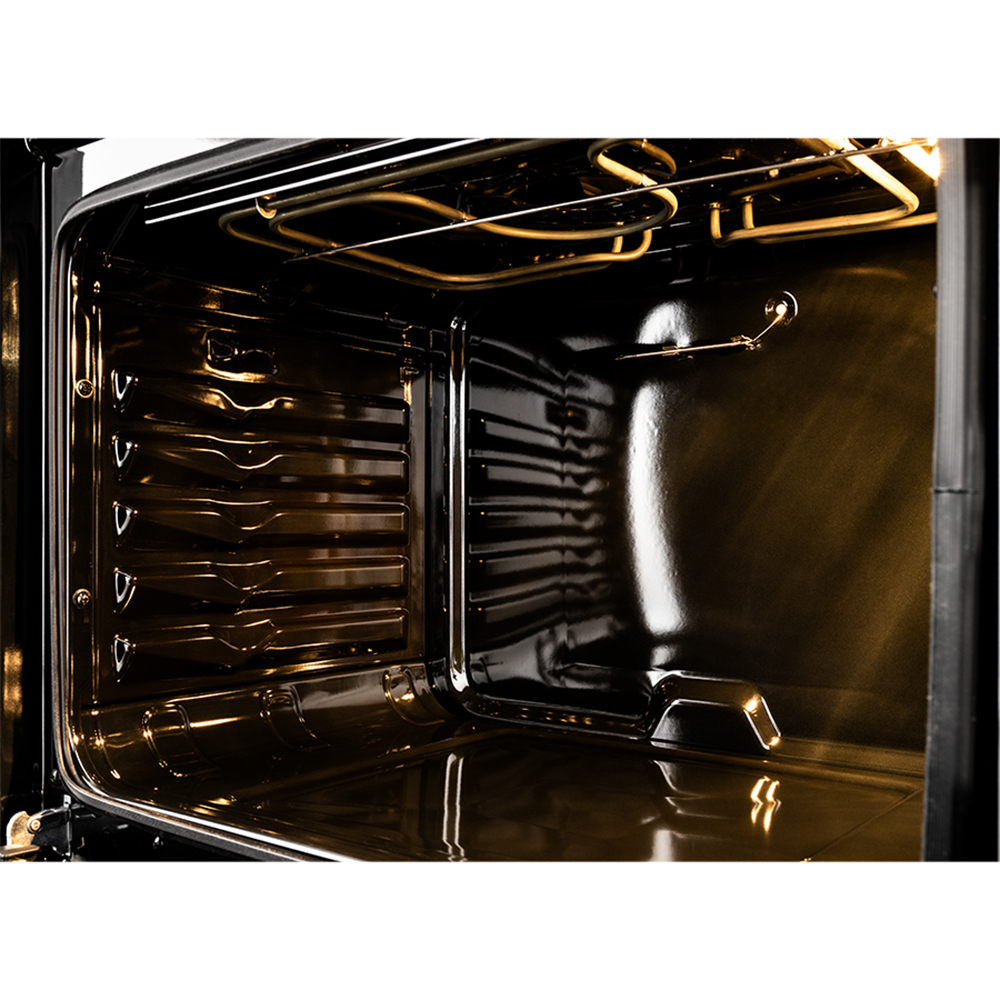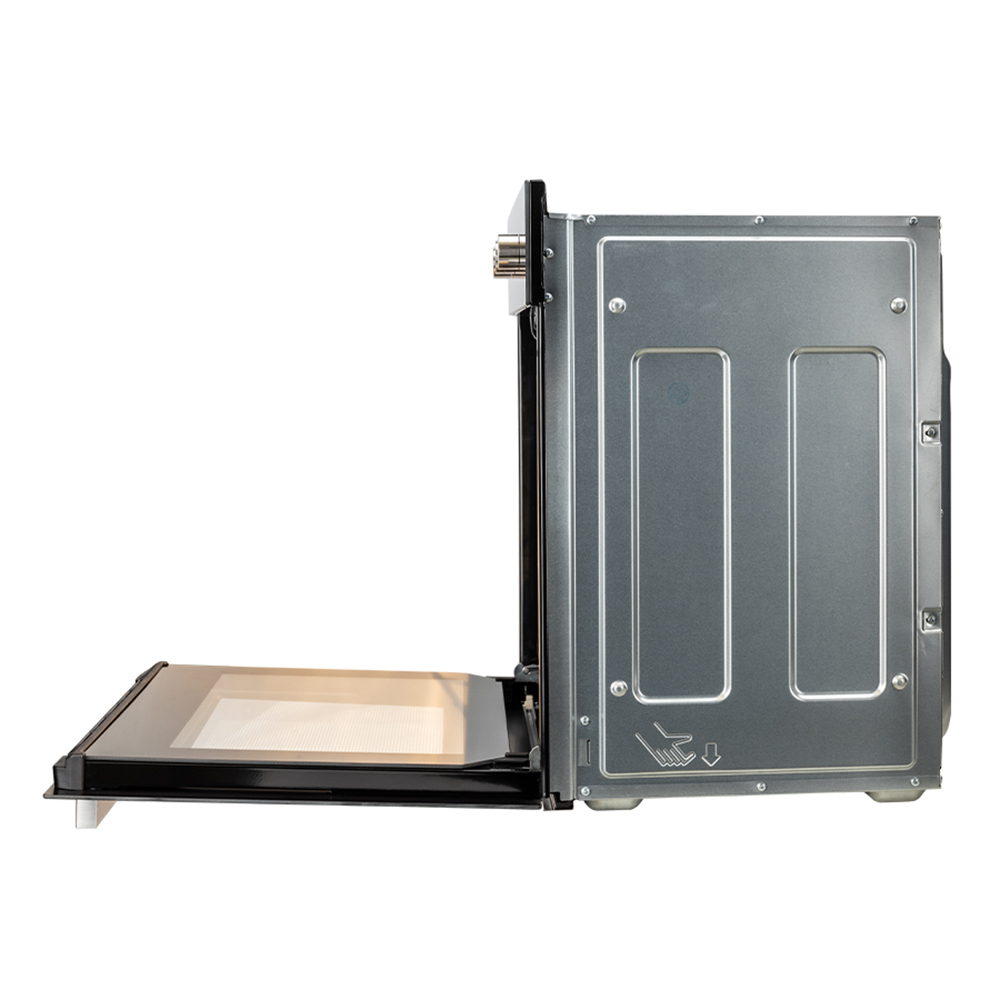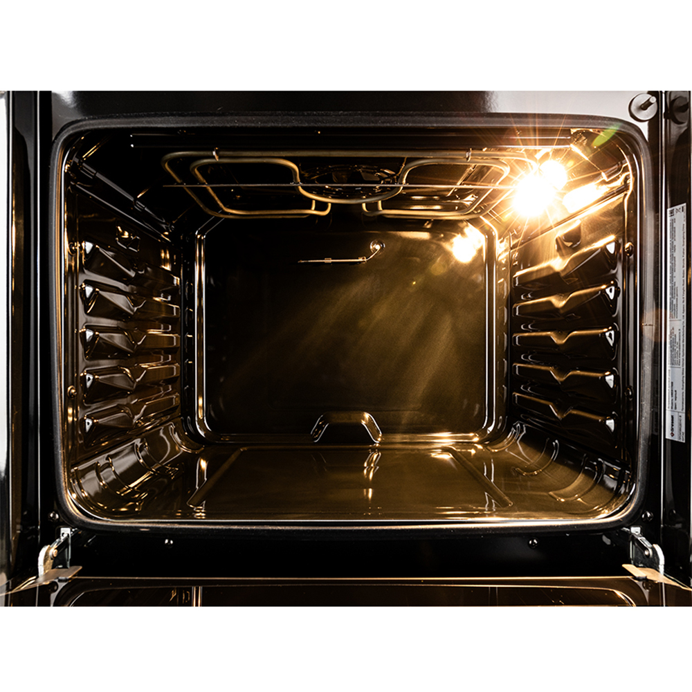 Особенность данной модели — функция аэрогриля, позволяющая приготовить продукты с аппетитной румяной корочкой, используя циркуляцию горячего воздуха и гриль. Всего в духовке 6 режимов (конвекция, гриль и др.), что даёт простор для экспериментов — от домашней выпечки до сочного запечённого мяса. Дверца с двойным стеклом защищает от перегрева, а рельефные направляющие помогают легко перемещать противни.