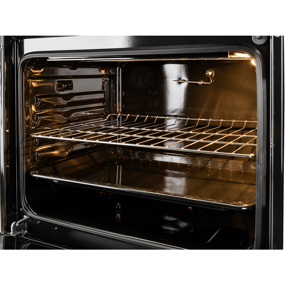 Рельефные направляющие обеспечивают устойчивое перемещение противней, а двойное остекление дверцы удерживает тепло внутри. При мощности 2050 Вт духовка достигает заданной температуры сравнительно быстро. Вентилятор охлаждения не даёт перегреться внешним поверхностям.