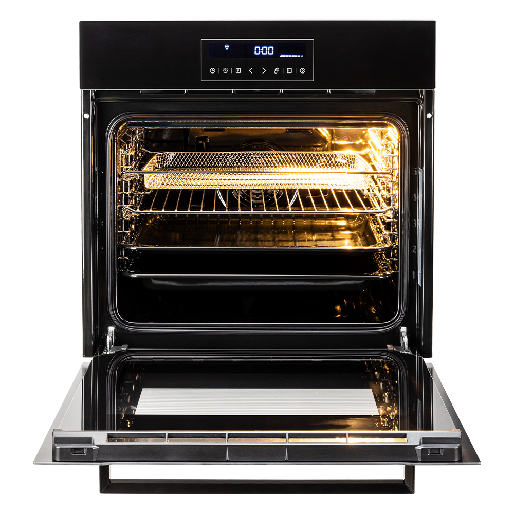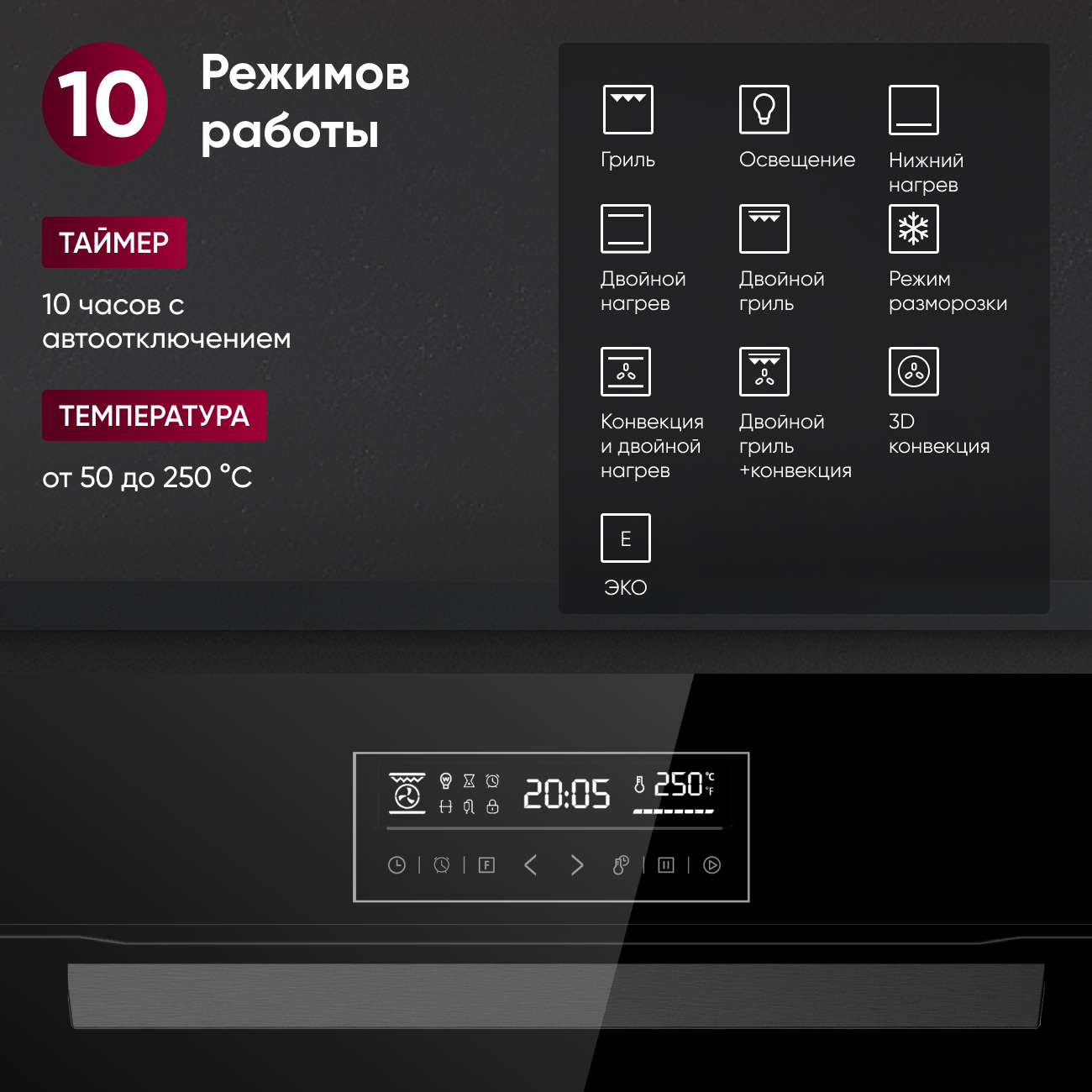 Мощность 3000 Вт и система автоотключения гарантируют безопасность и ускоренный разогрев. Двойное стекло дверцы удерживает высокую температуру внутри, снижая риск ожога. Вы с лёгкостью настраиваете таймер и режимы работы через сенсорную панель, а дисплей отображает ключевую информацию о процессе готовки.