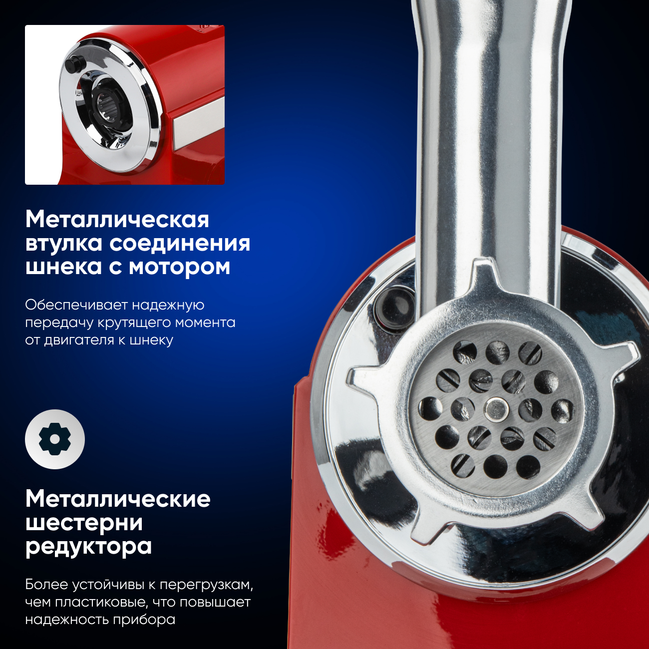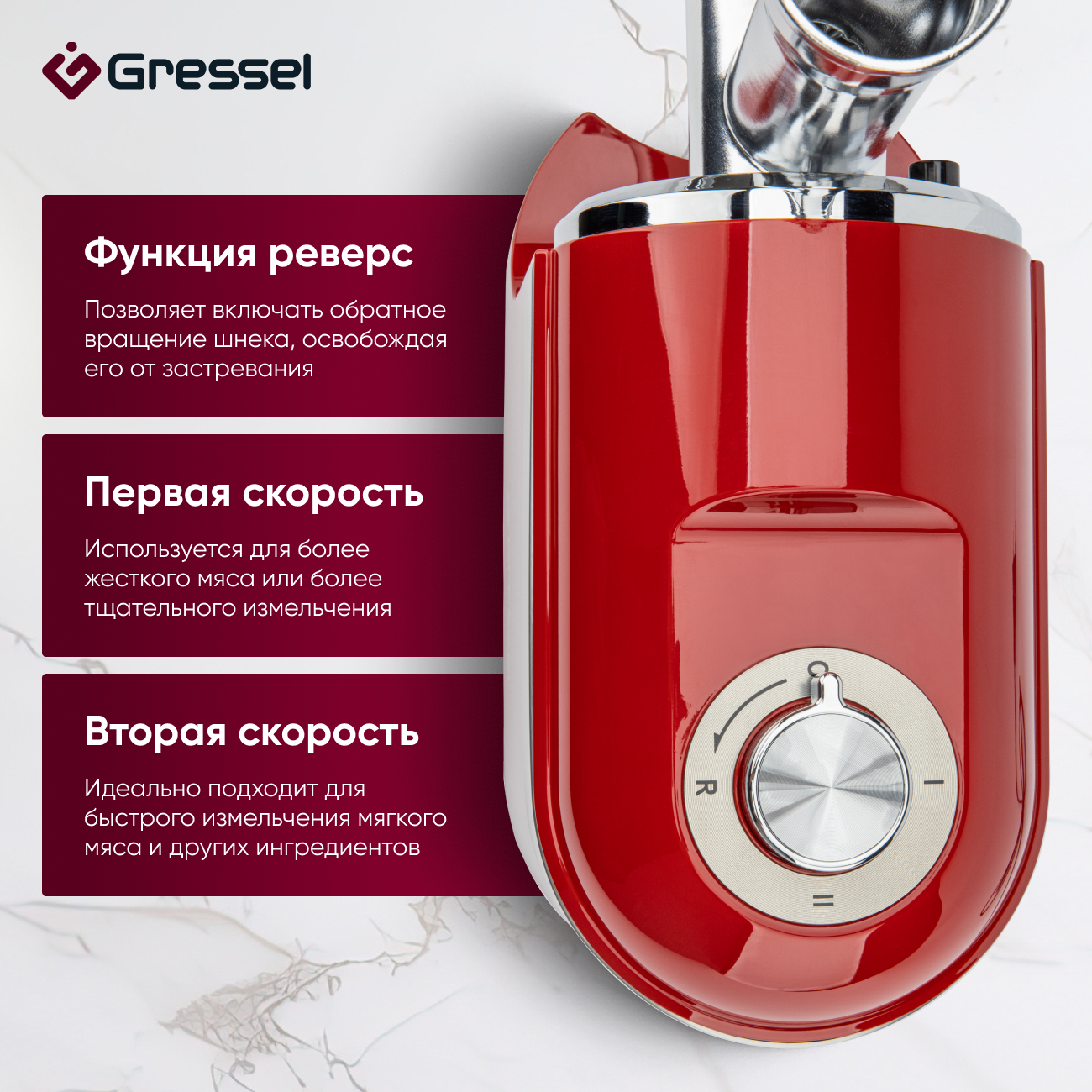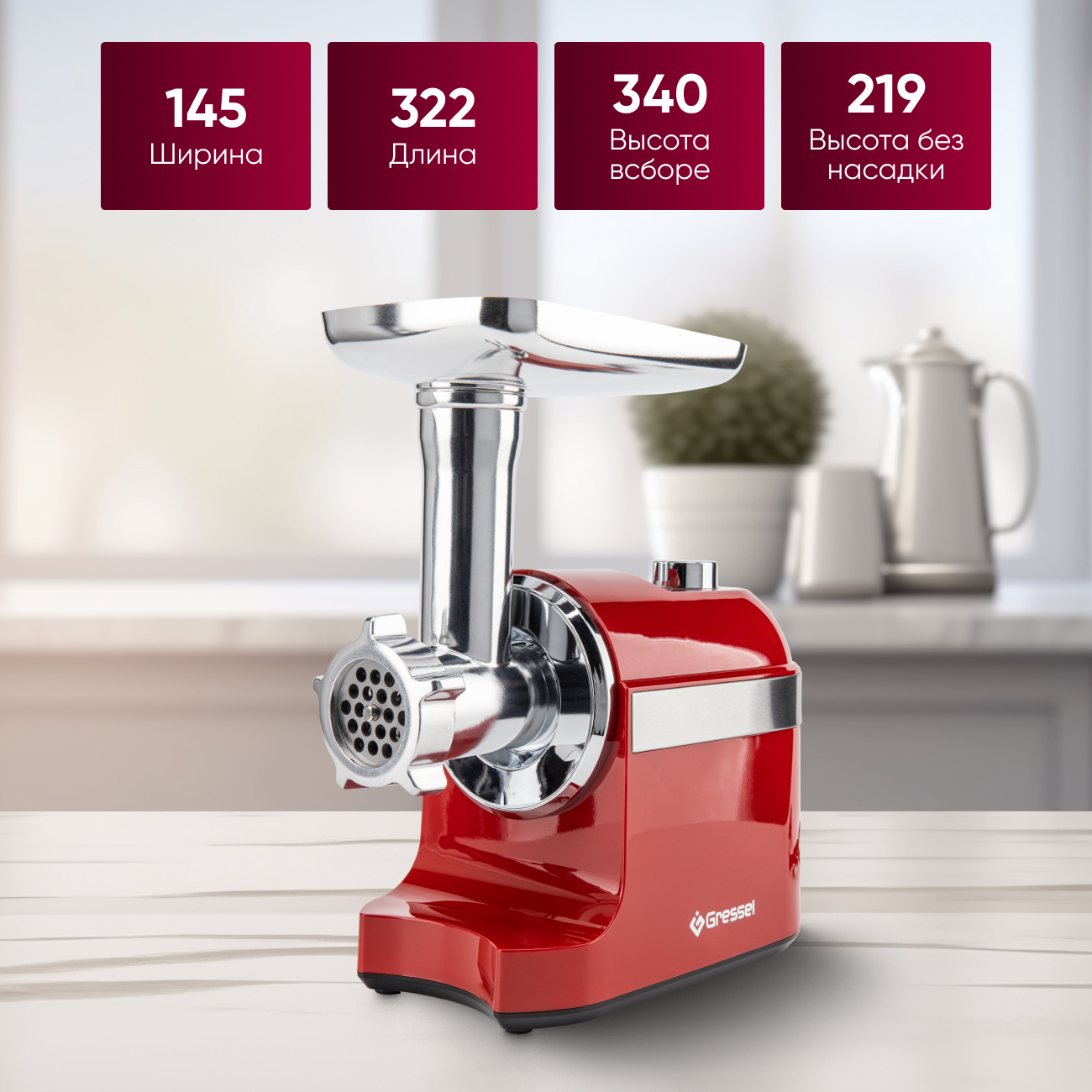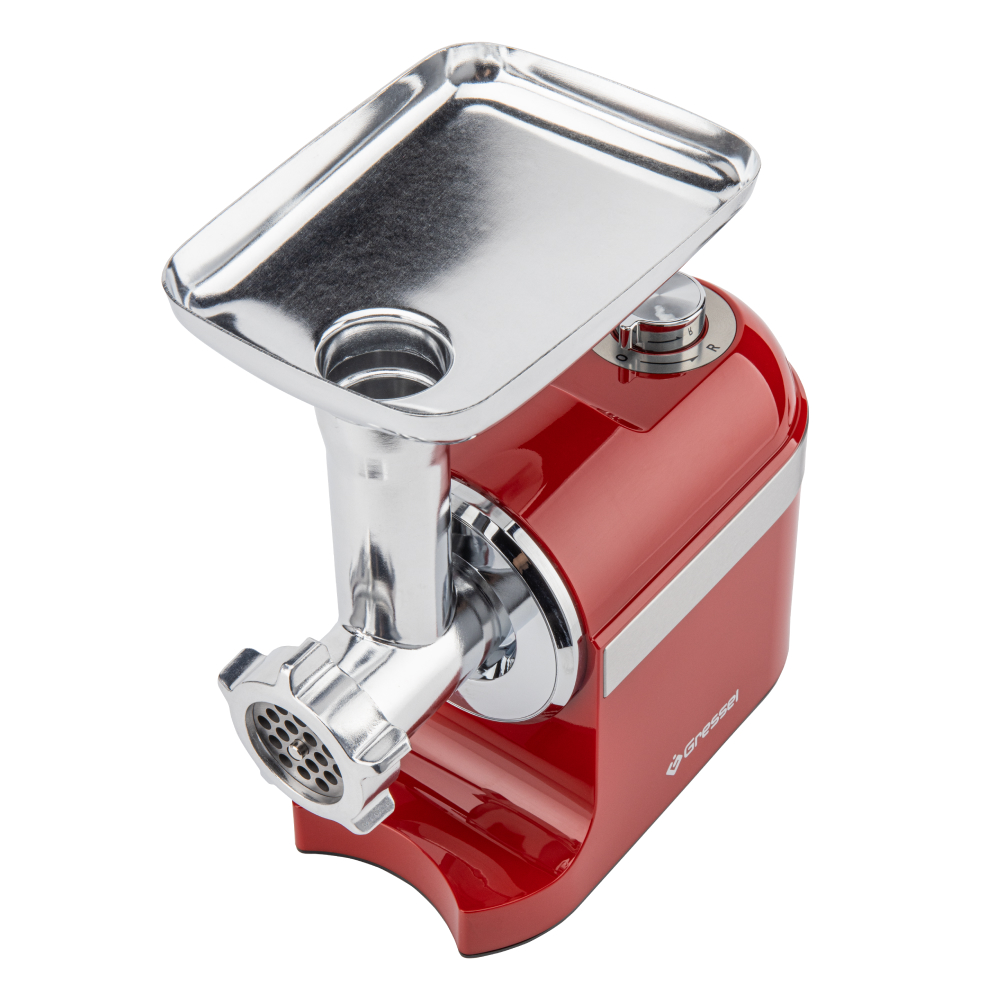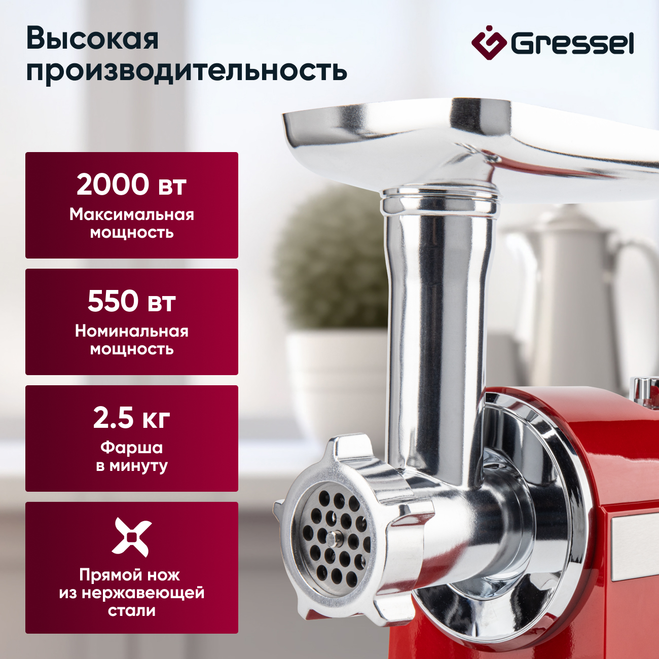 Мясорубка электрическая Gressel GMG-1702, красная, 2000Вт, металлические шестерни, насадки для кеббе и колбасок, 3 решетки для фарша
