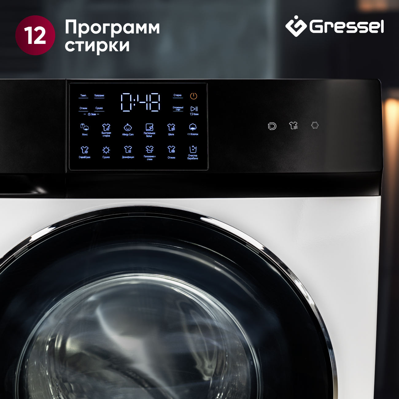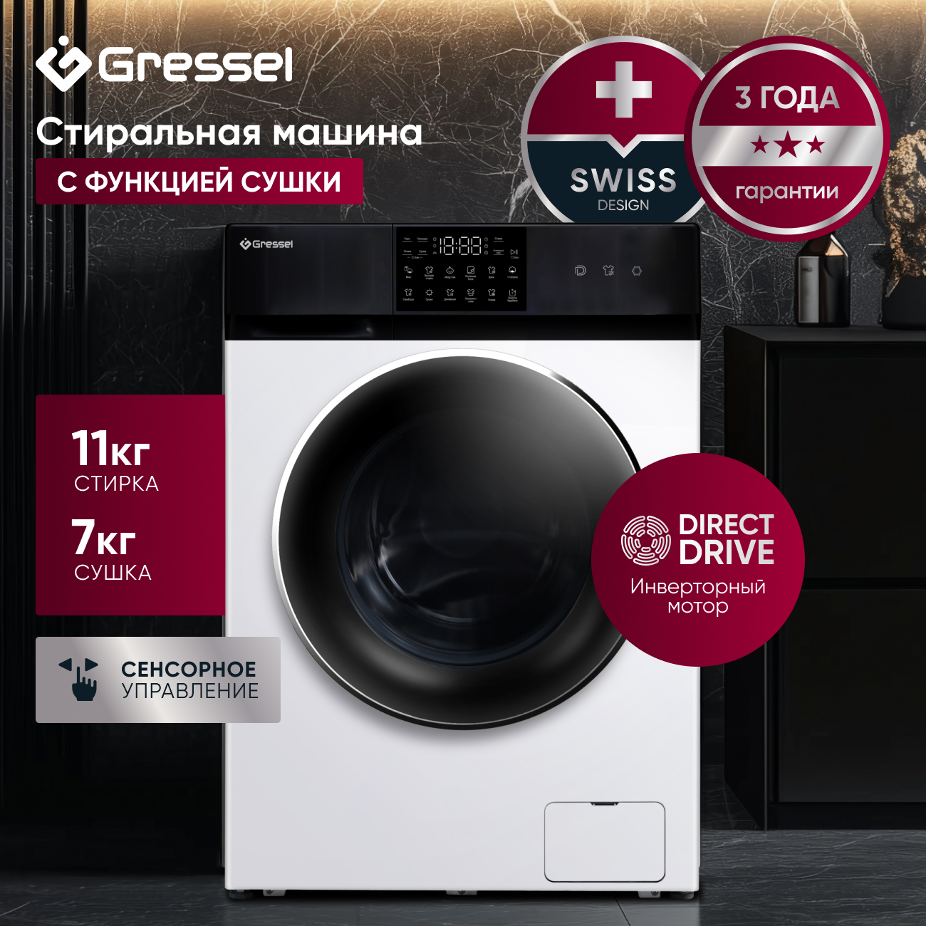 Стиральная машина с сушкой Gressel UWS602 (11 кг),с инверторным мотором Direct Drive, сенсорным управлением, дозагрузкой белья, 12 программ, системой самодиагностики, 1200 оборотов