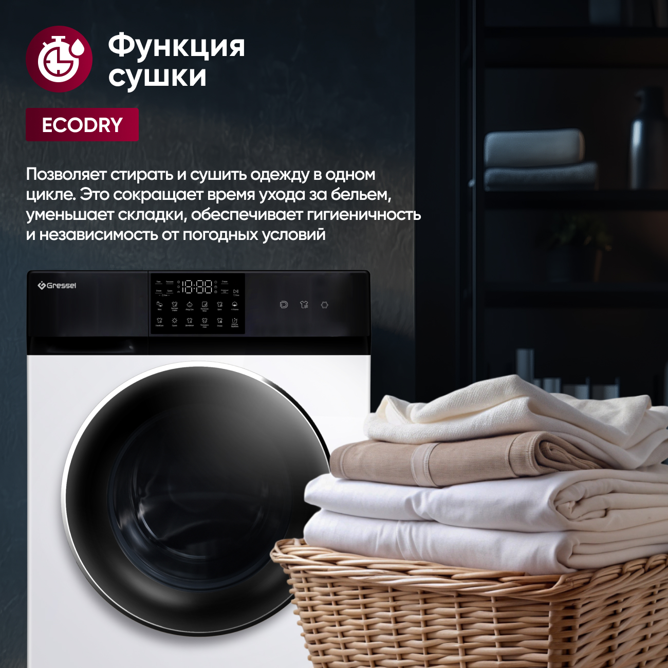 Функция EcoDry позволяет одновременно стирать и сушить белье, что экономит время и энергию.