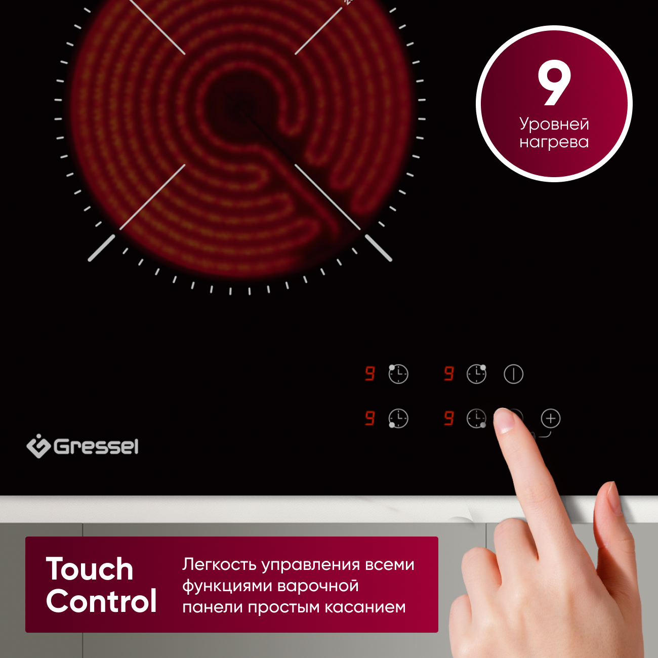 Панель управляется с помощью современной системы Touch Control, обеспечивающей легкость и точность в настройке с 9 уровнями нагрева. Интегрированный таймер до 99 минут позволяет точно контролировать время приготовления, автоматически выключая конфорку по окончании установленного времени и оповещая о готовности блюда звуковым сигналом.