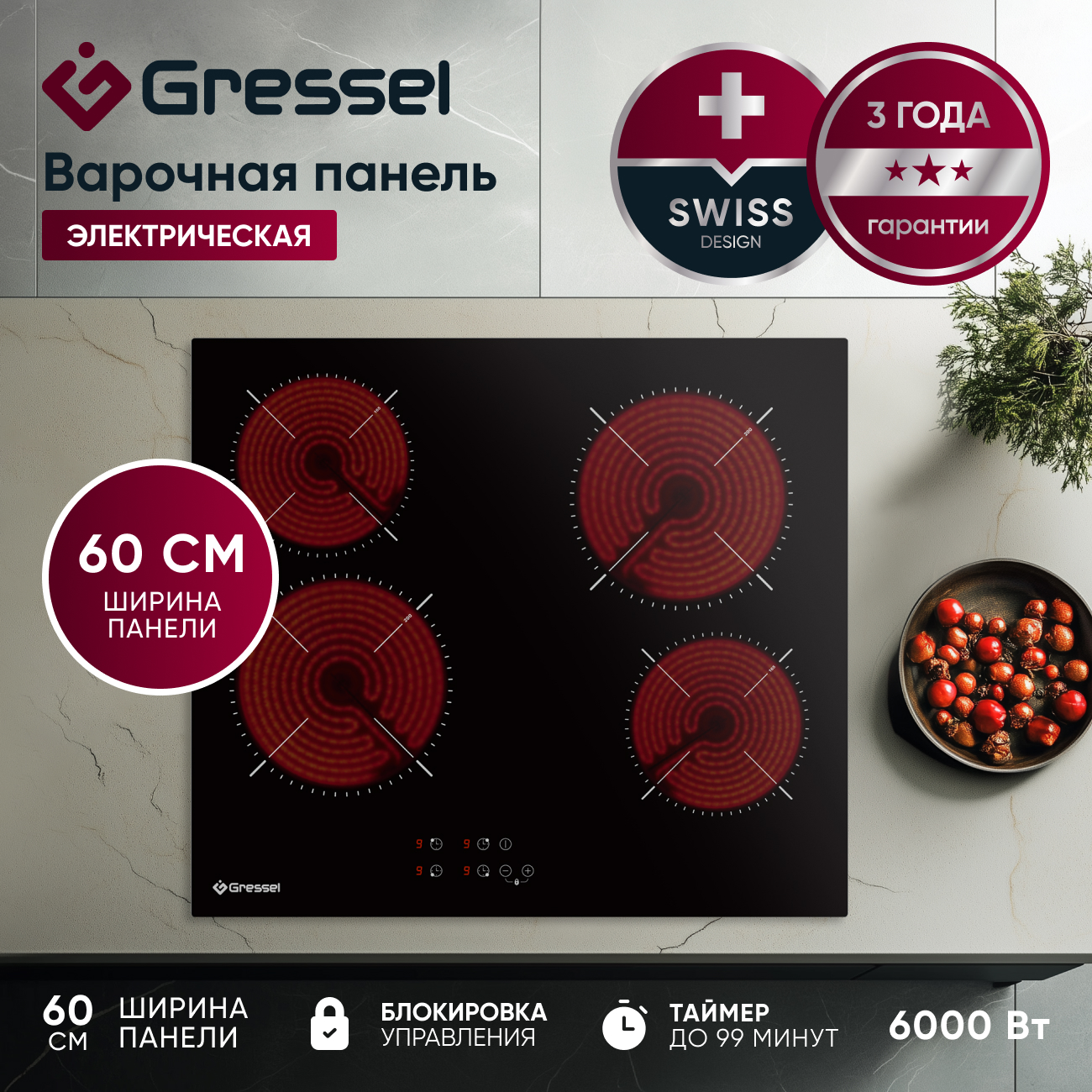 Закаленное стекло не только придает варочной панели изящный внешний вид, но и упрощает уборку, делая ее обслуживание быстрым и эффективным. Электрическая варочная панель Gressel U60D14S000 — это идеальное сочетание стиля, мощности и функциональности для любой современной кухни.