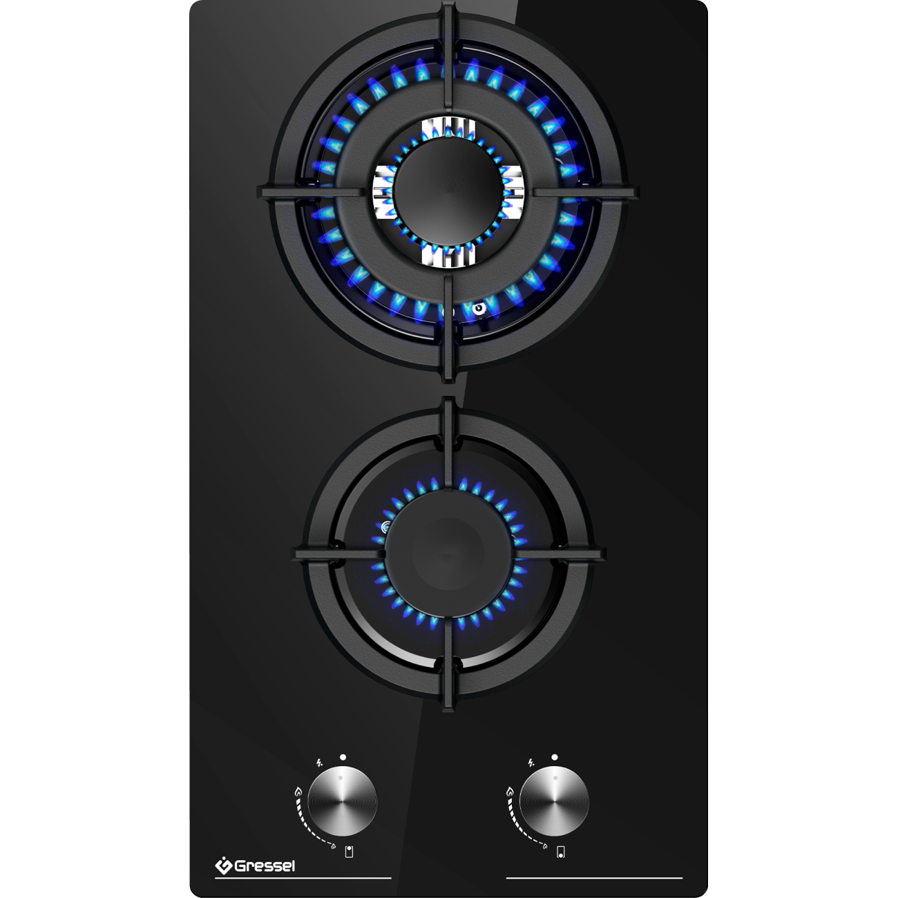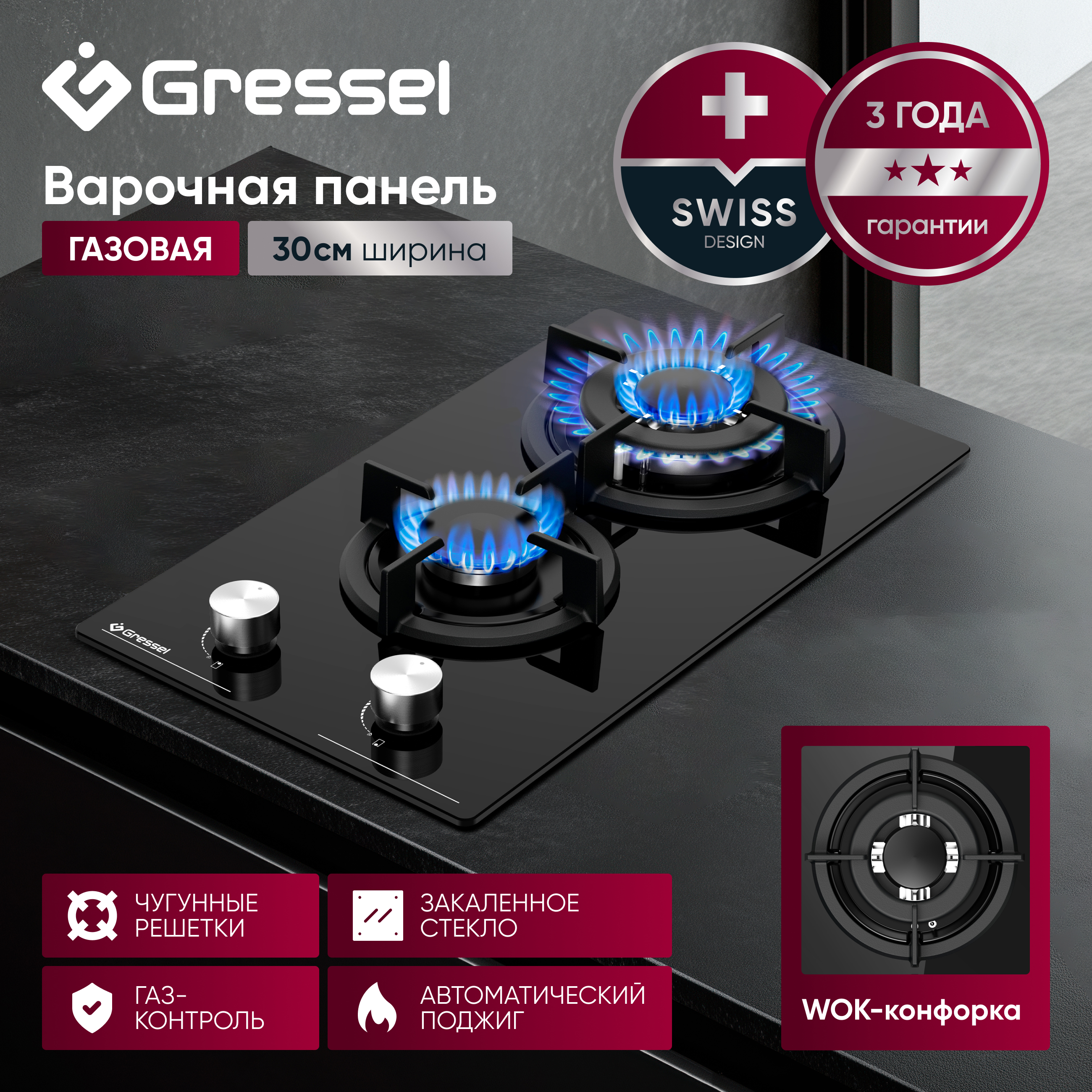Газовая варочная панель GRESSEL U30N20S000 30 см, закаленное стекло, WOK-конфорка, автоматический розжиг, газ-контроль, чугунные решетки