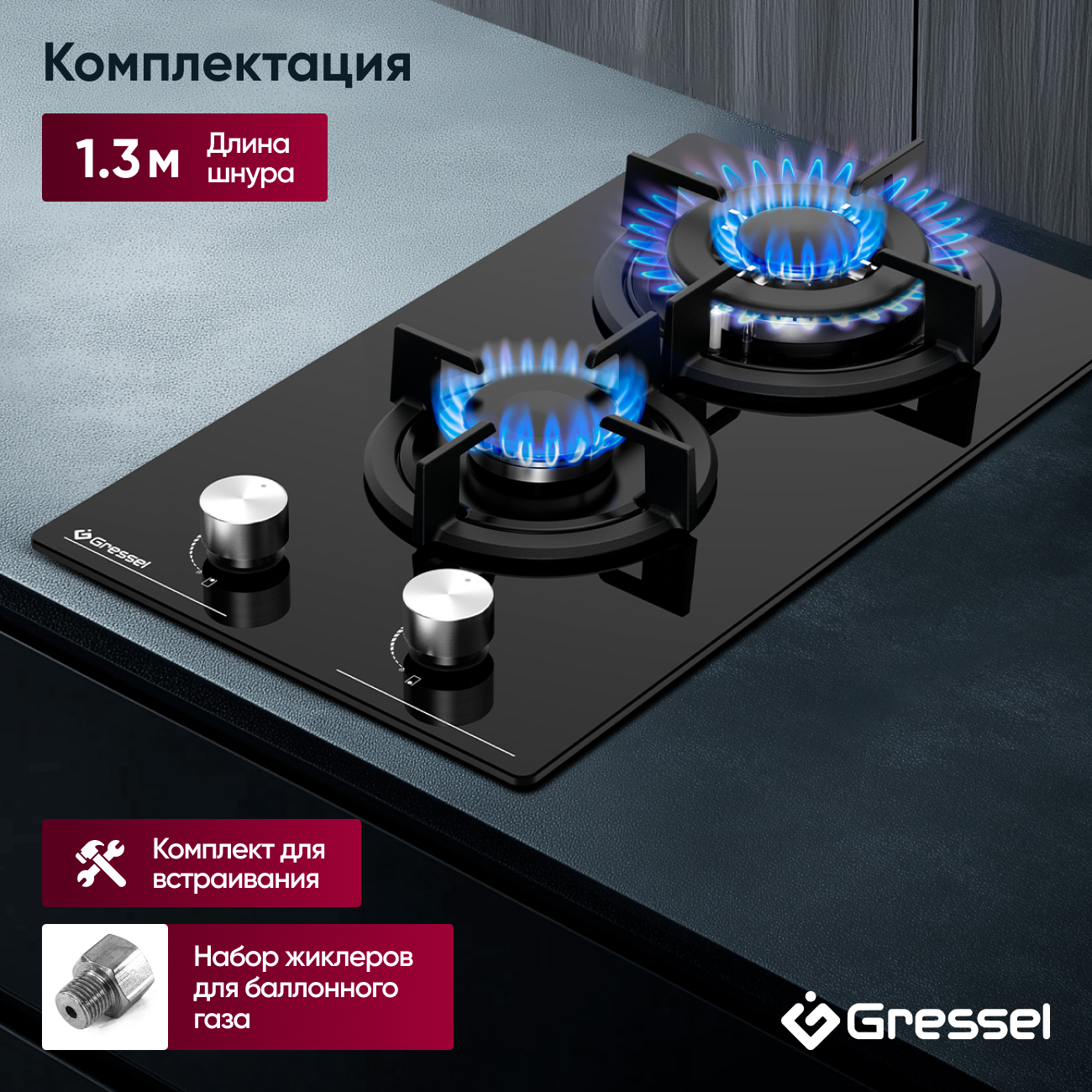 Комплектация: Включает монтажный комплект, набор жиклеров для баллонного газа и шнур длиной 1,3 м.