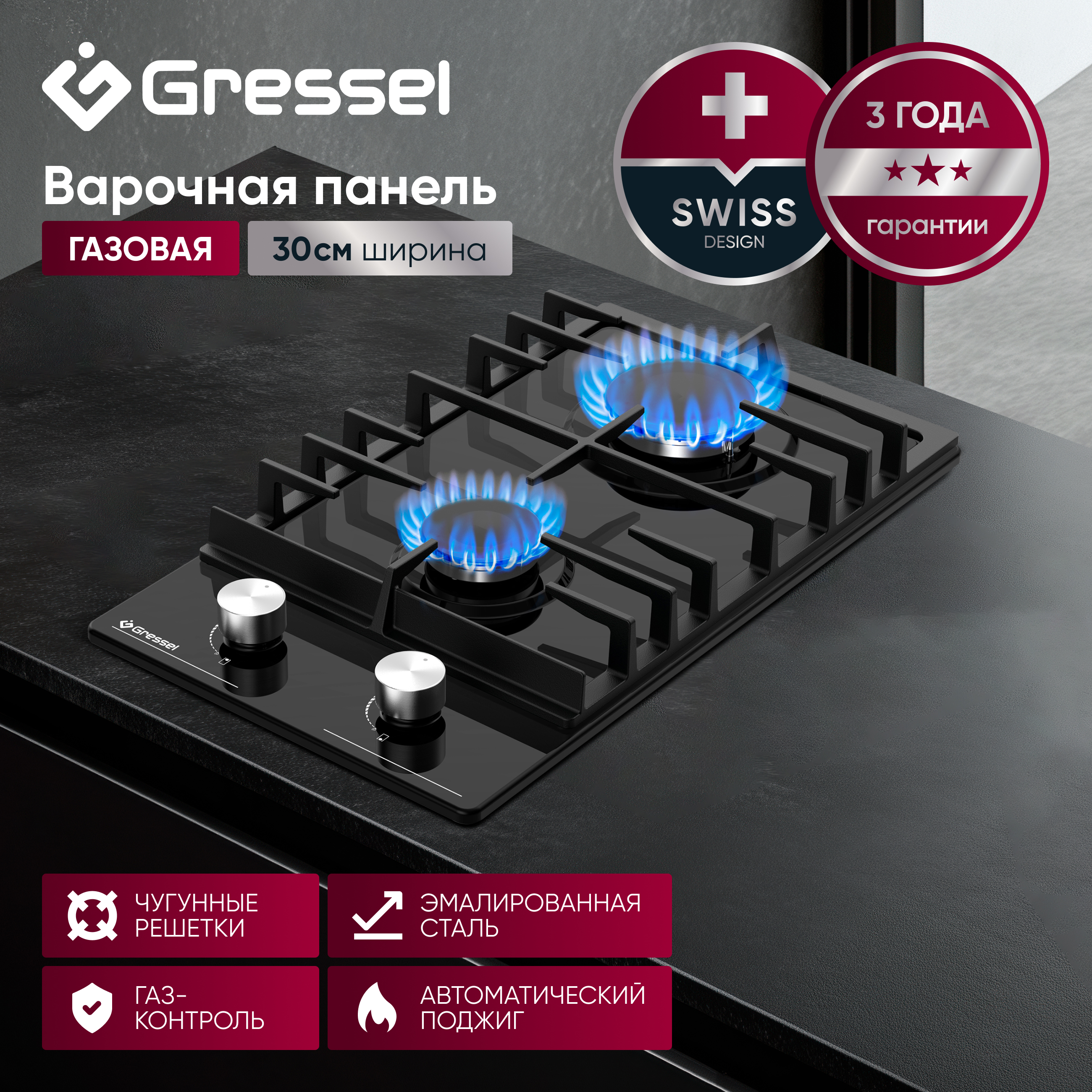 Газовая варочная панель GRESSEL U30V20B001 30 см, эмалированная сталь, автоматический розжиг, газ-контроль, чугунные решетки