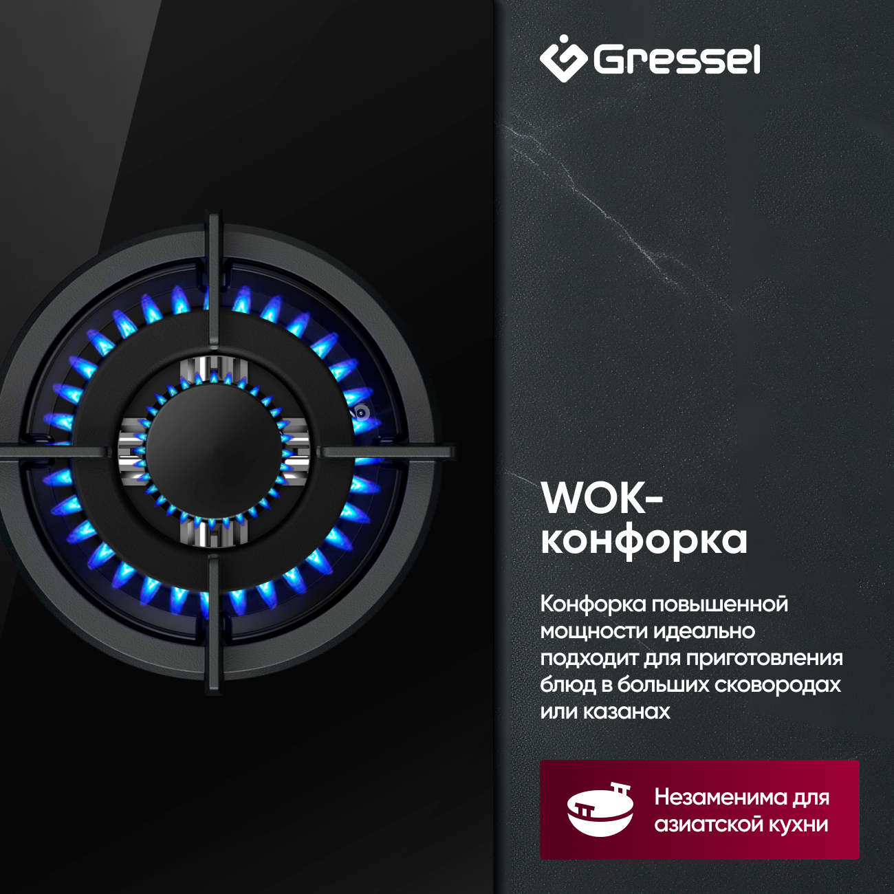 WOK-конфорка: Конфорка повышенной мощности 3500 Вт (132 мм) позволяет готовить блюда в больших сковородах и казанах, что идеально подходит для любителей азиатской кухни.