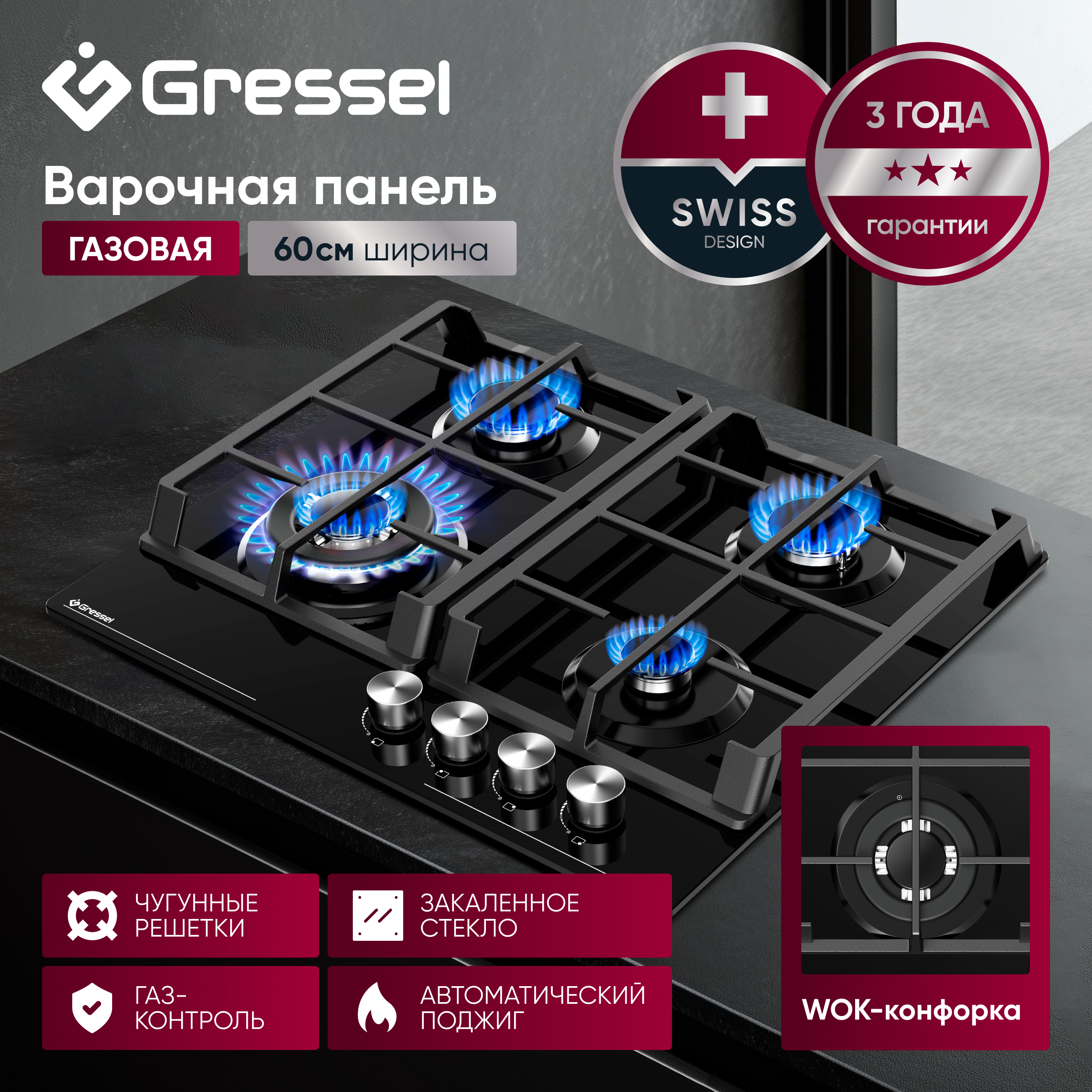 Газовая варочная панель GRESSEL U60H41S001 60 см, закаленное стекло, WOK-конфорка, автоматический розжиг, газ-контроль, чугунные решетки