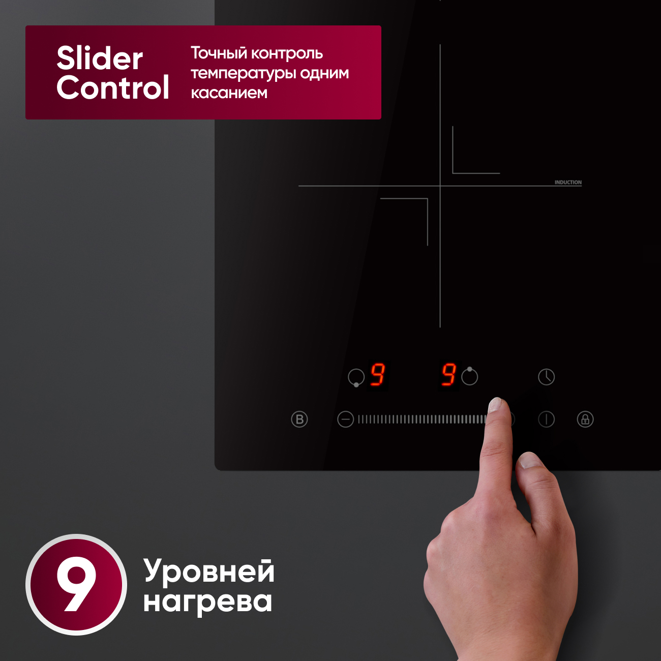 Ключевой особенностью панели является Slider control — интуитивно понятная система управления, позволяющая точно регулировать температуру с 9 уровнями нагрева. Функция Boost значительно ускоряет процесс приготовления, позволяя вскипятить пол-литра воды за считанные секунды или мгновенно разогреть сковороду.