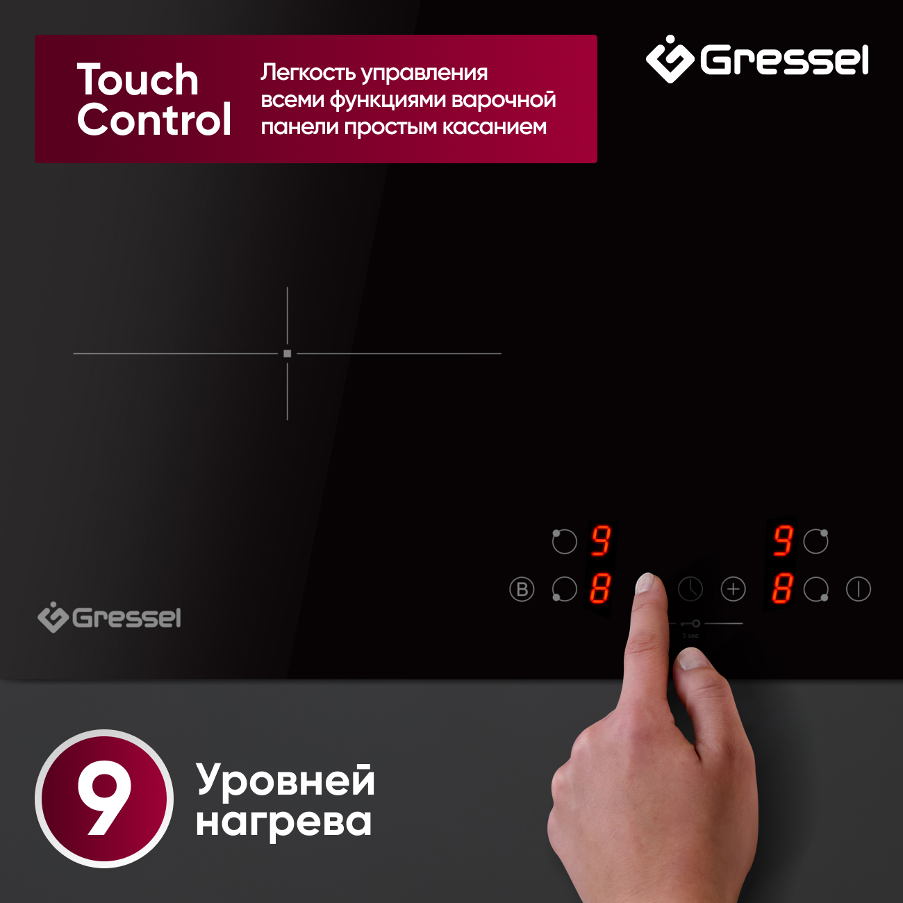 Каждая конфорка оснащена датчиком наличия посуды, гарантирующим энергоэффективность и безопасность, включаясь только при обнаружении подходящей посуды. Система Touch control обеспечивает легкое и точное управление с 9 уровнями нагрева, а встроенный таймер до 99 минут позволяет автоматически отключить панель после завершения приготовления, сопровождая это звуковым сигналом.