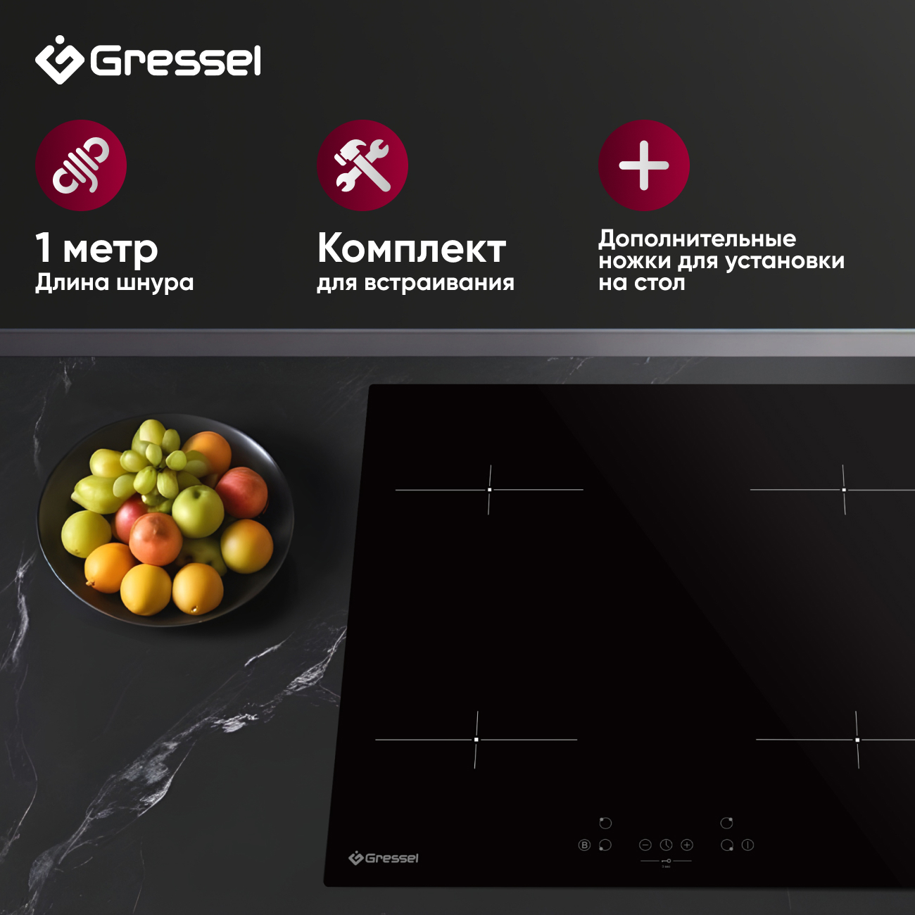 Встраиваемая индукционная варочная панель GRESSEL U60I74S000, 60 см, 7000Вт, сенсорное управление Touch control, блокировка, защита от перегрева, датчик наличия посуды, таймер