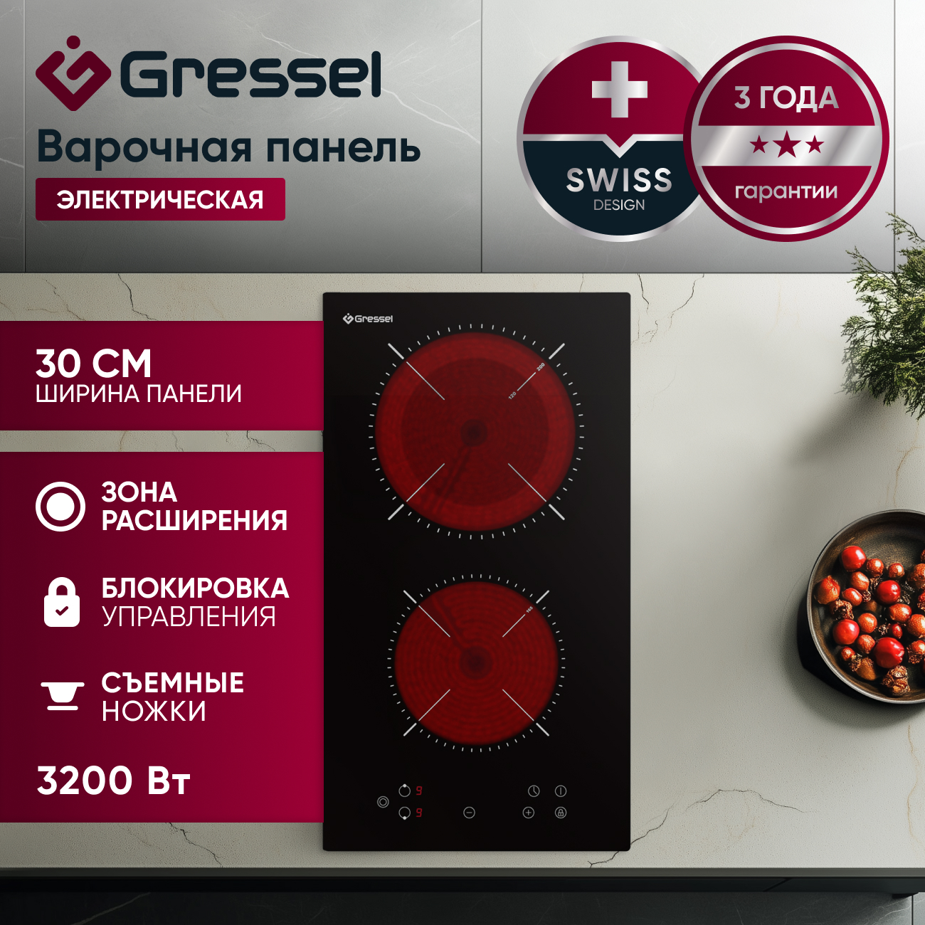 Настольная электрическая варочная панель Gressel TTD28S000-30, 30 см, 3200Вт, сенсорная панель Touch Control, зона расширения, блокировка, таймер