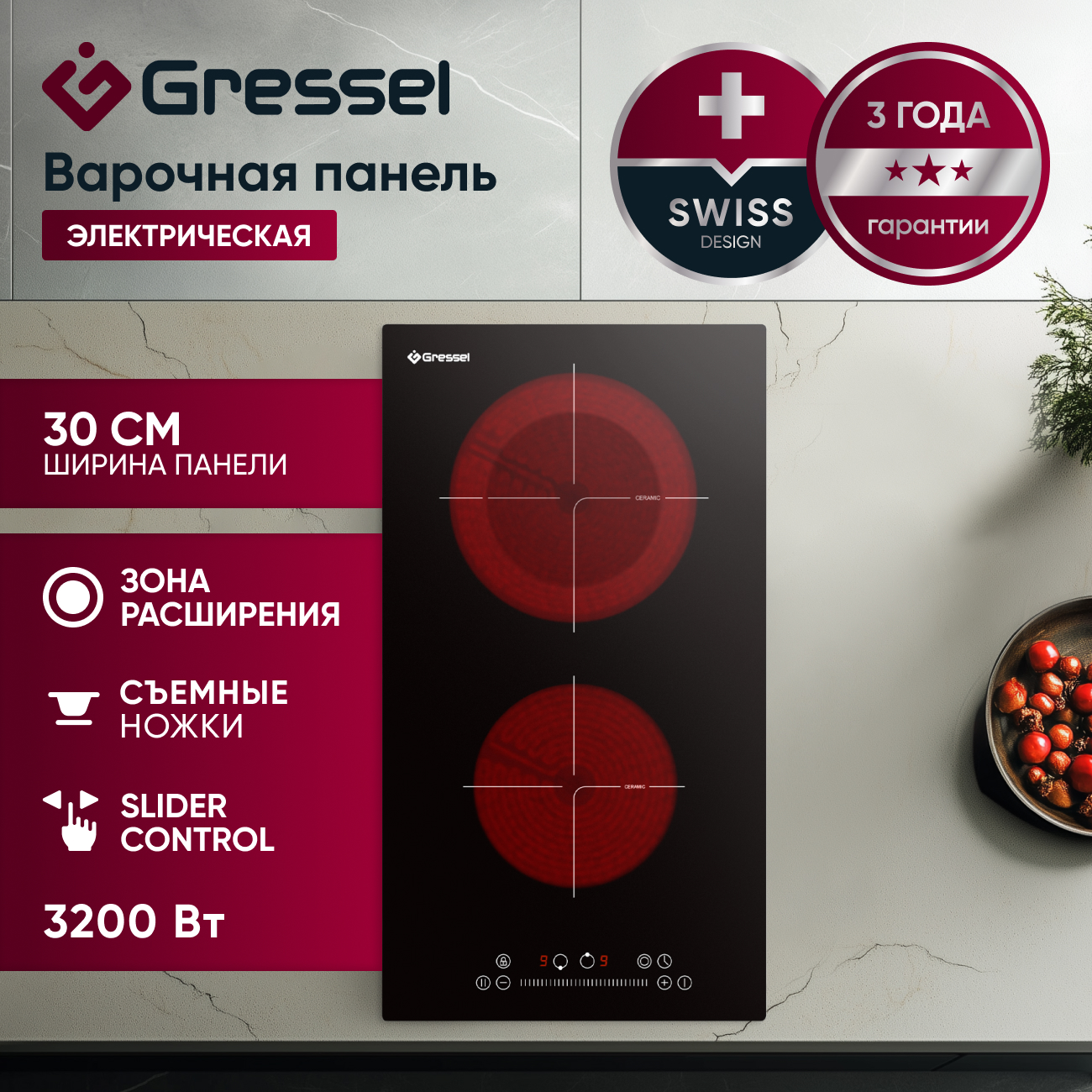 Настольная электрическая варочная панель Gressel TTD28S100-30, 30 см, 3200Вт, сенсорная панель Slider control, зона расширения, блокировка, таймер