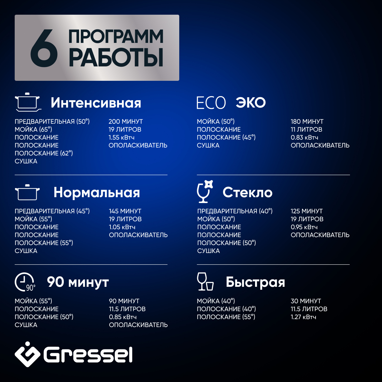 Повысьте комфорт на кухне с помощью Gressel UBB602 — полноразмерной встраиваемой модели, рассчитанной на 14 комплектов посуды. Помимо 6 стандартных программ (интенсивная, нормальная, эко, стекло, быстрая, 90 мин), эта машина предлагает ряд интересных функций, включая автоматическое открытие дверцы по завершении цикла. Благодаря такой особенности посуда быстрее высыхает естественным образом, дополнительно экономя энергию.