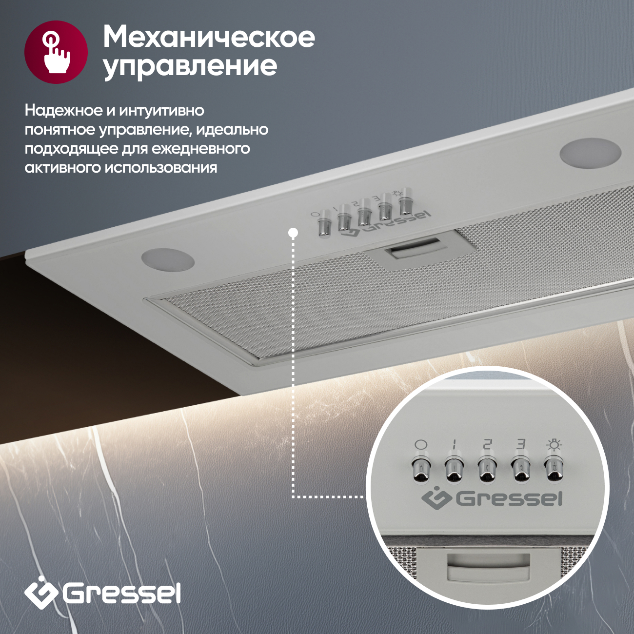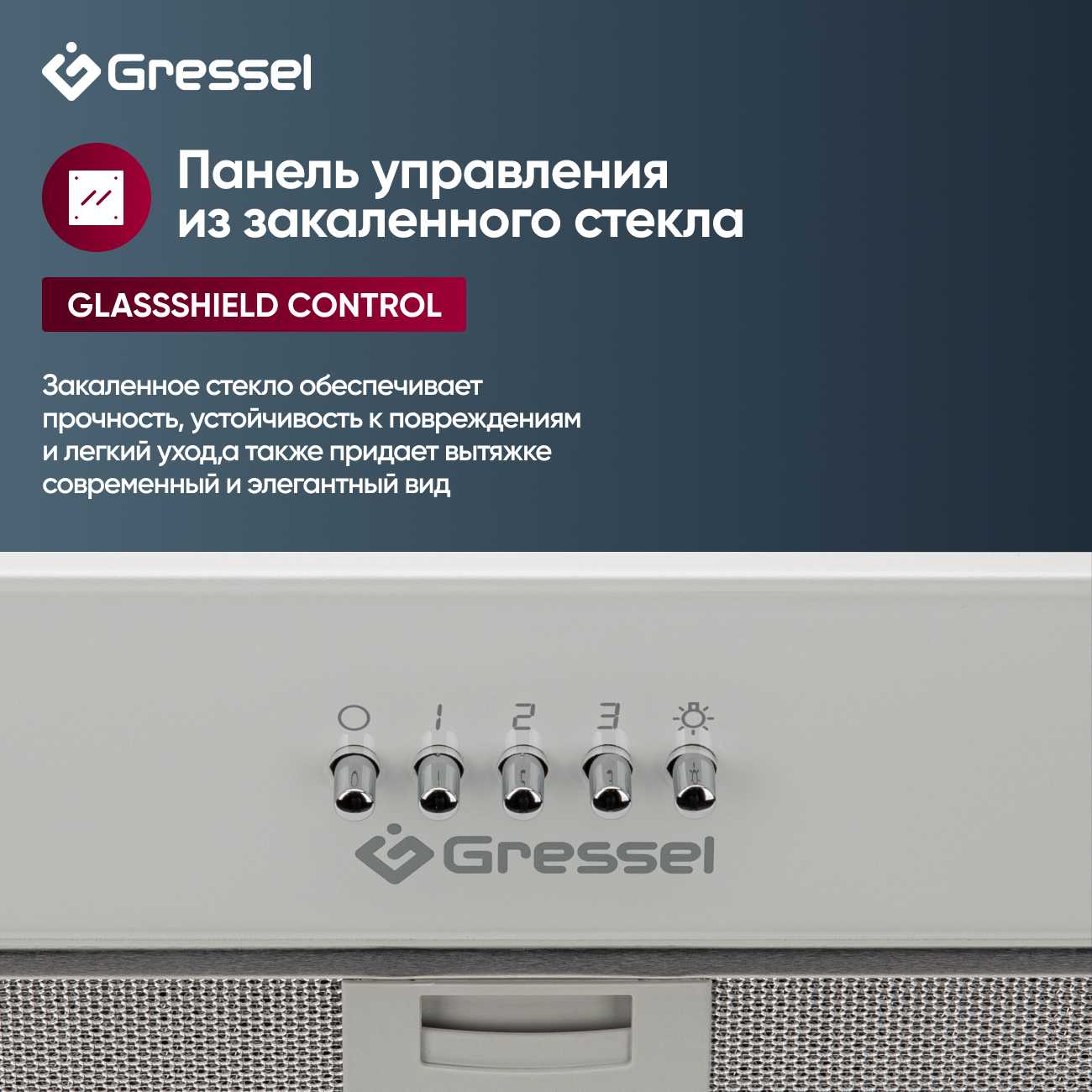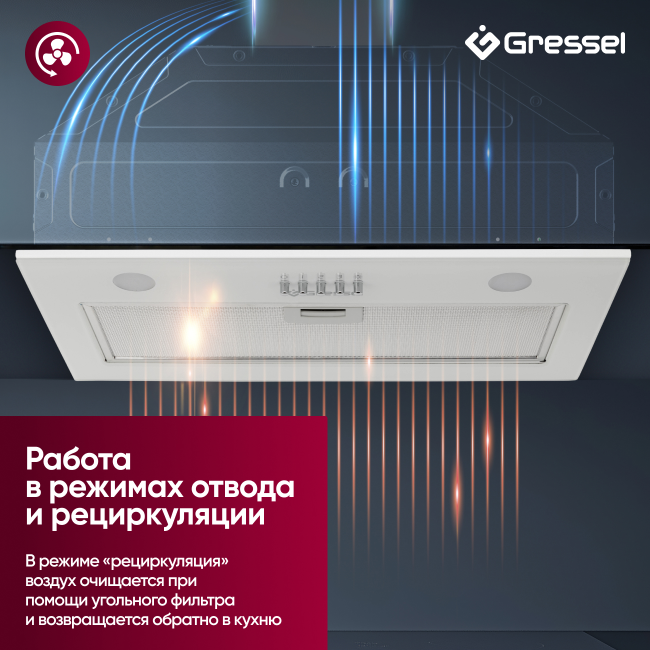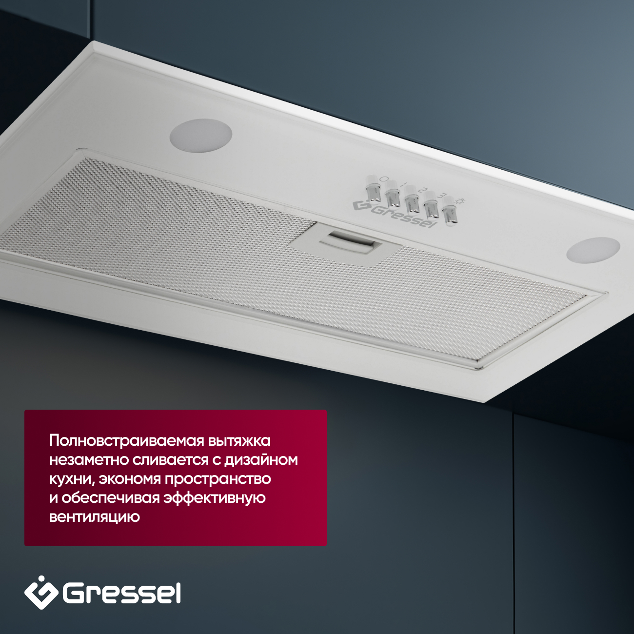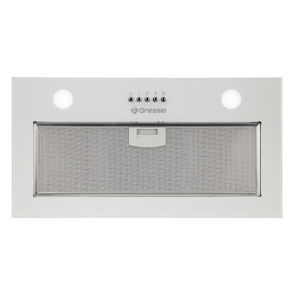 Встраиваемая вытяжка Gressel GR52W2 52 см (полновстраиваемая), LED подсветка, 3 скорости, GlassShield Control, режим отвода и рециркуляции, механическое управление, белая