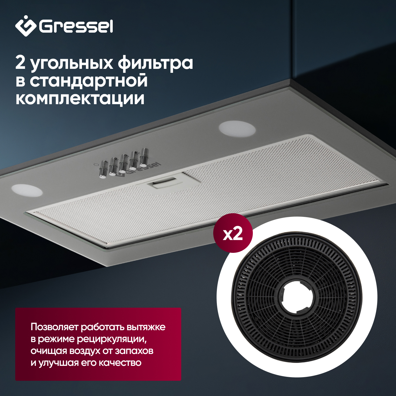 Особое преимущество вытяжки — комплектация угольным фильтром, который позволяет использовать её в режиме рециркуляции. Это идеально для помещений, где невозможно организовать вытяжку воздуха наружу. Фильтр эффективно улавливает жиры и запахи, возвращая в помещение чистый воздух.