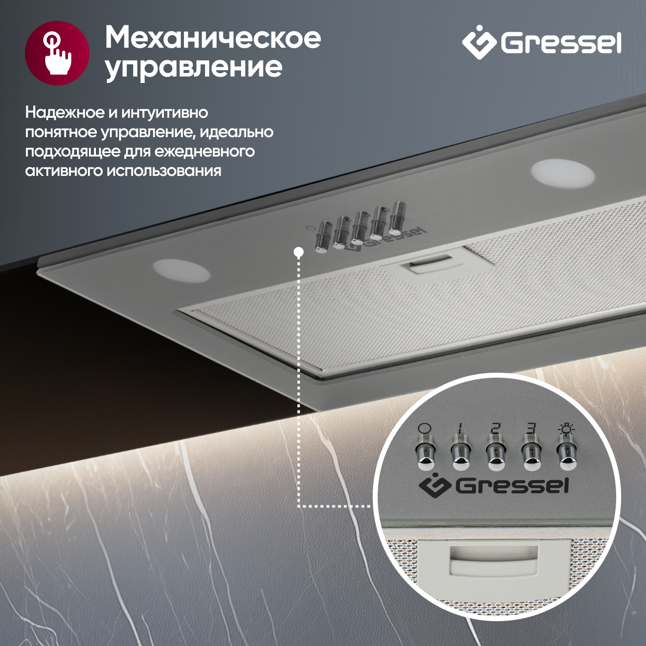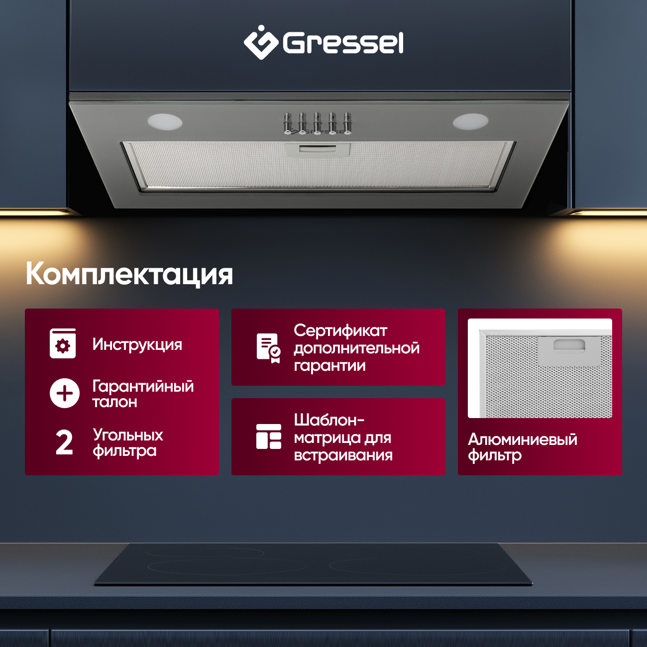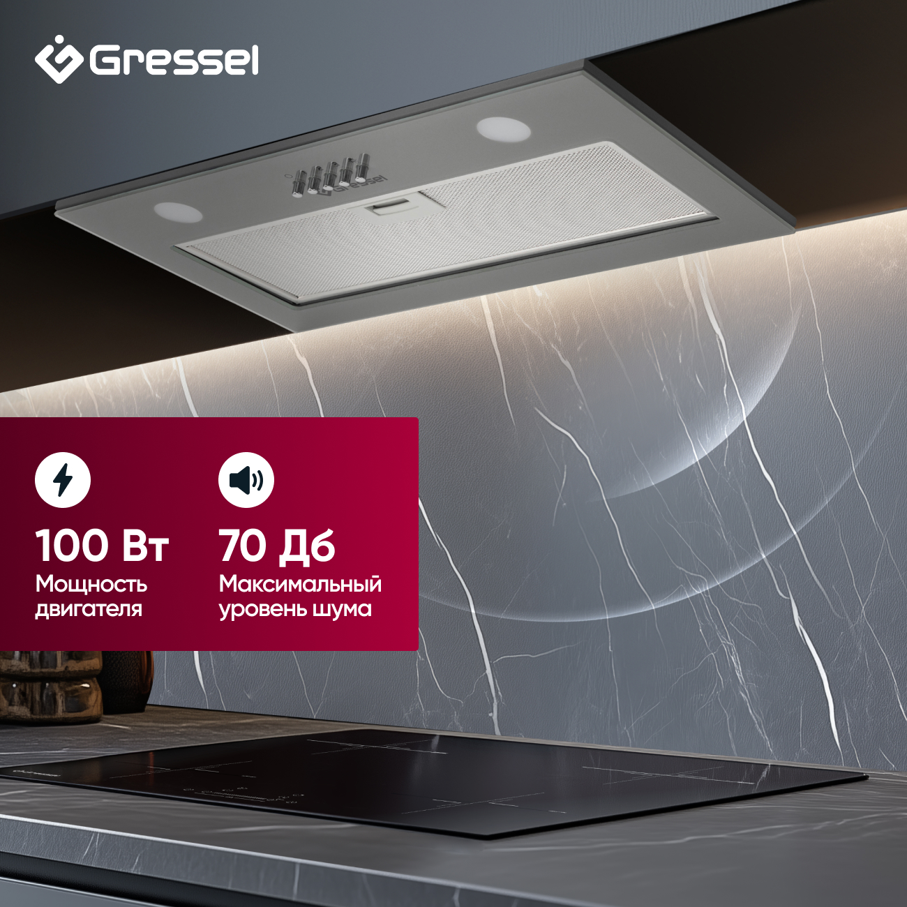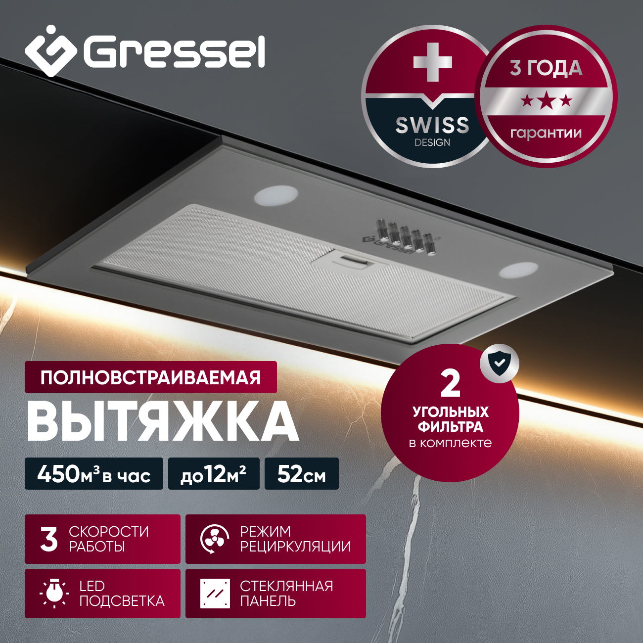 Вытяжка Gressel также оснащена LED-подсветкой, которая делает процесс пользования удобнее в условиях недостаточной освещенности. Дизайн вытяжки со стеклянной панелью и возможностью полной встраиваемости делает её идеальным выбором для каждой кухни, дополняя и улучшая любой интерьер.