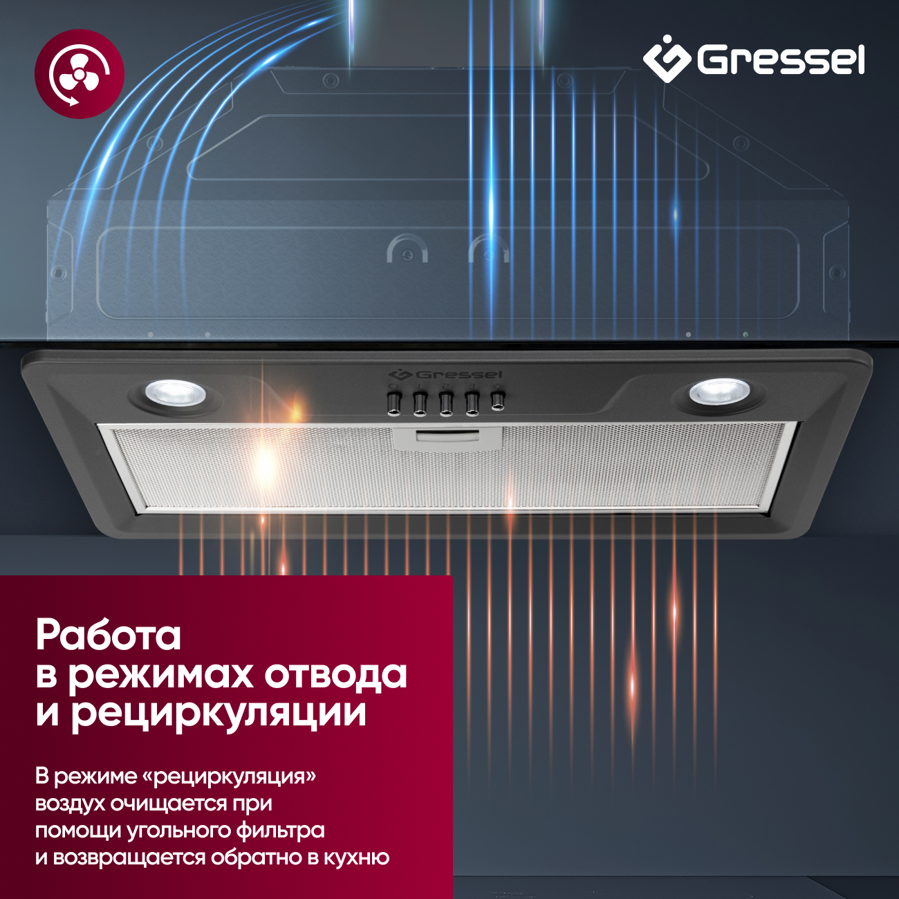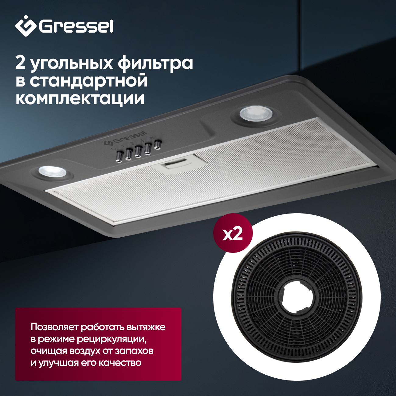 Встраиваемая вытяжка Gressel GR52M 52 см (полновстраиваемая), LED подсветка, 3 скорости, режим отвода и рециркуляции, механическое управление, серая