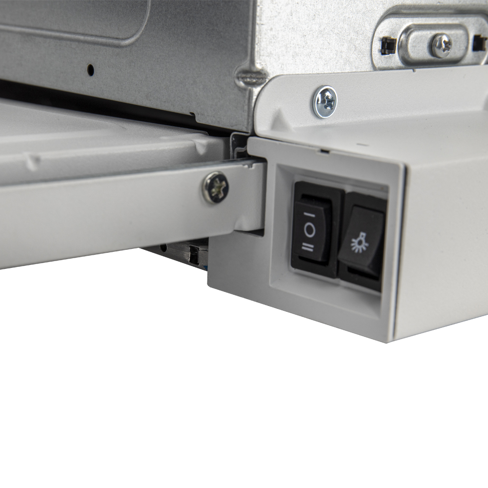 Вытяжка оснащена двумя скоростями работы, механическим управлением для надежности и простоты использования, и LED подсветкой, которая добавляет удобства и создает приятную атмосферу во время приготовления пищи.