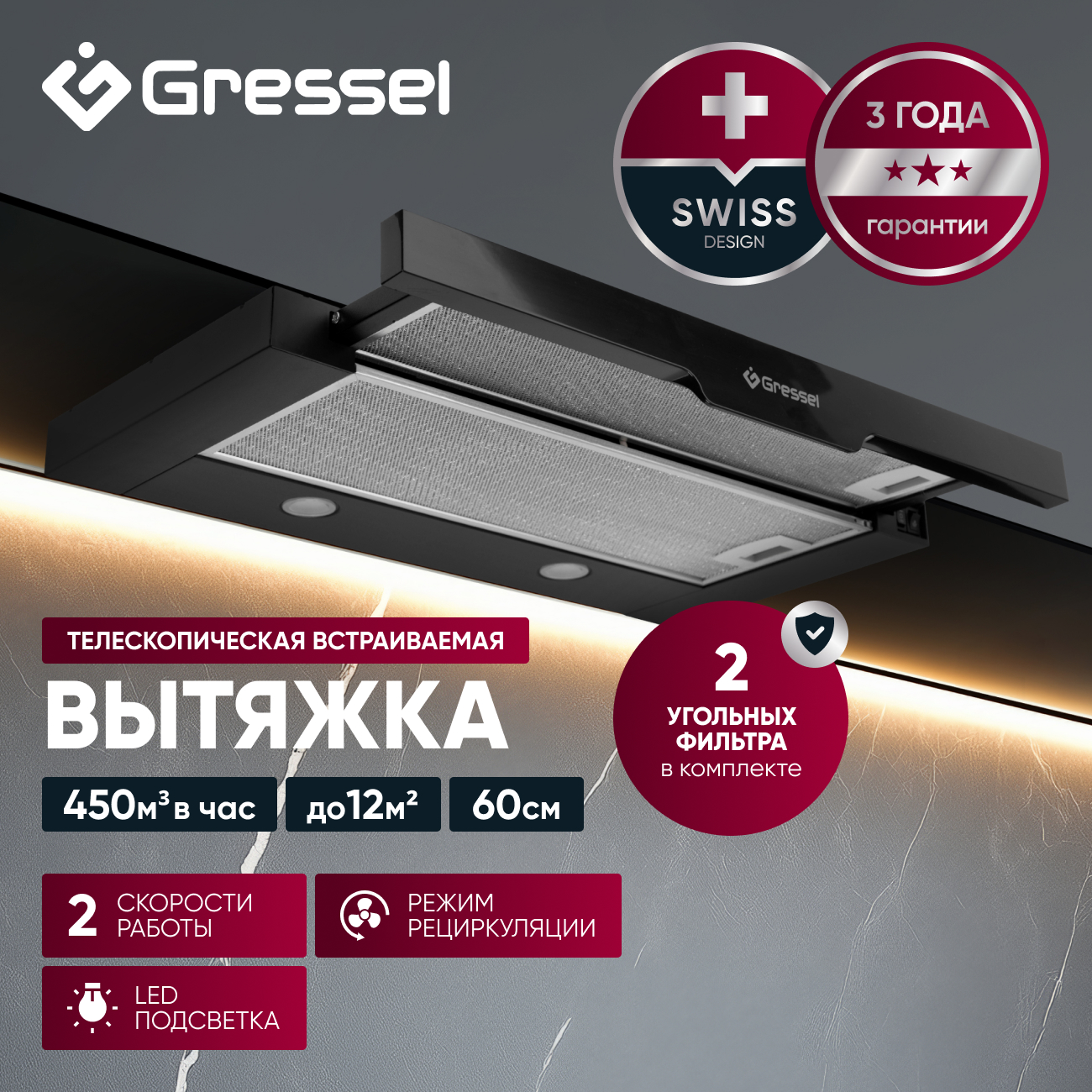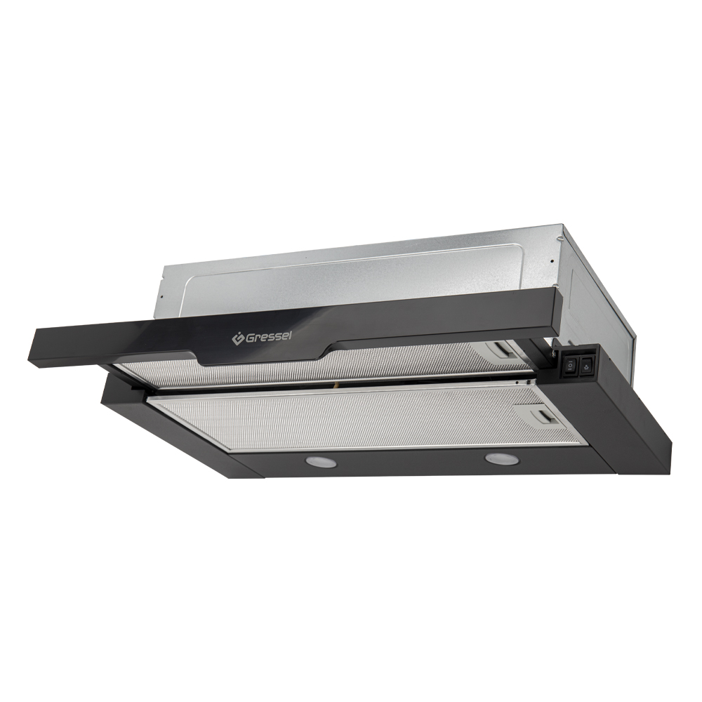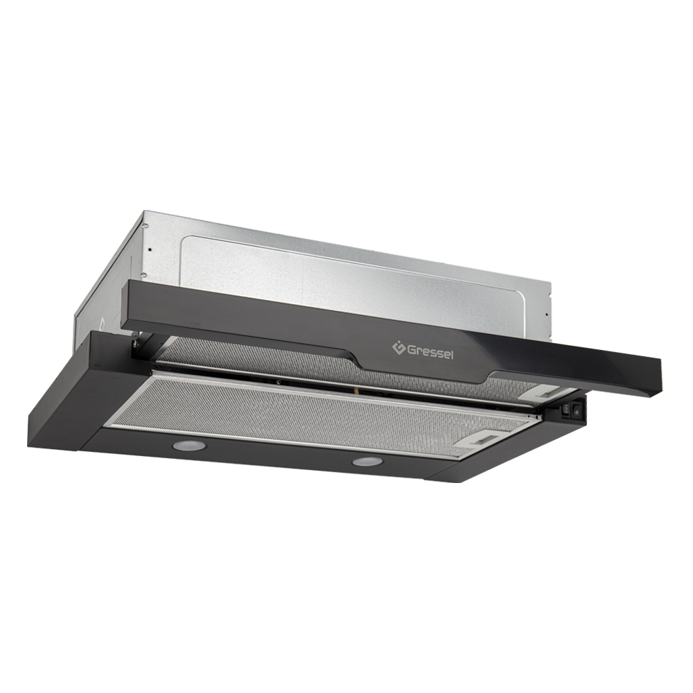 Встраиваемая вытяжка Gressel GR61B1 60 см (телескопическая), LED подсветка, 2 скорости, режим рециркуляции, механическое управление, черная