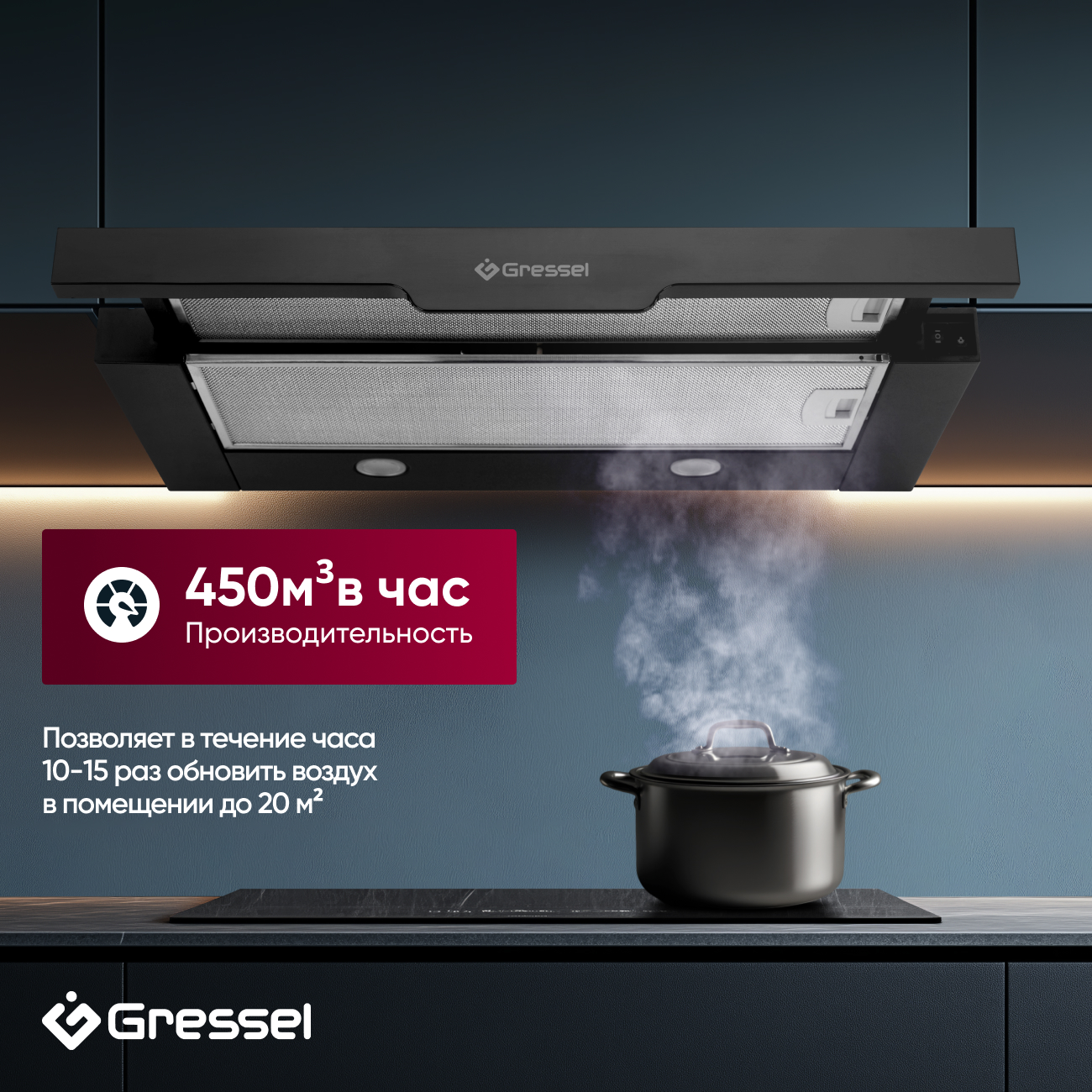 Телескопическая система позволяет выдвигать вытяжку только при необходимости, что сохраняет пространство и усиливает ее эффективность. С производительностью в 450 м³/ч, вытяжка способна до 15 раз за час полностью обновить воздух в помещении до 20 м², обеспечивая отличную вентиляцию даже в больших пространствах.